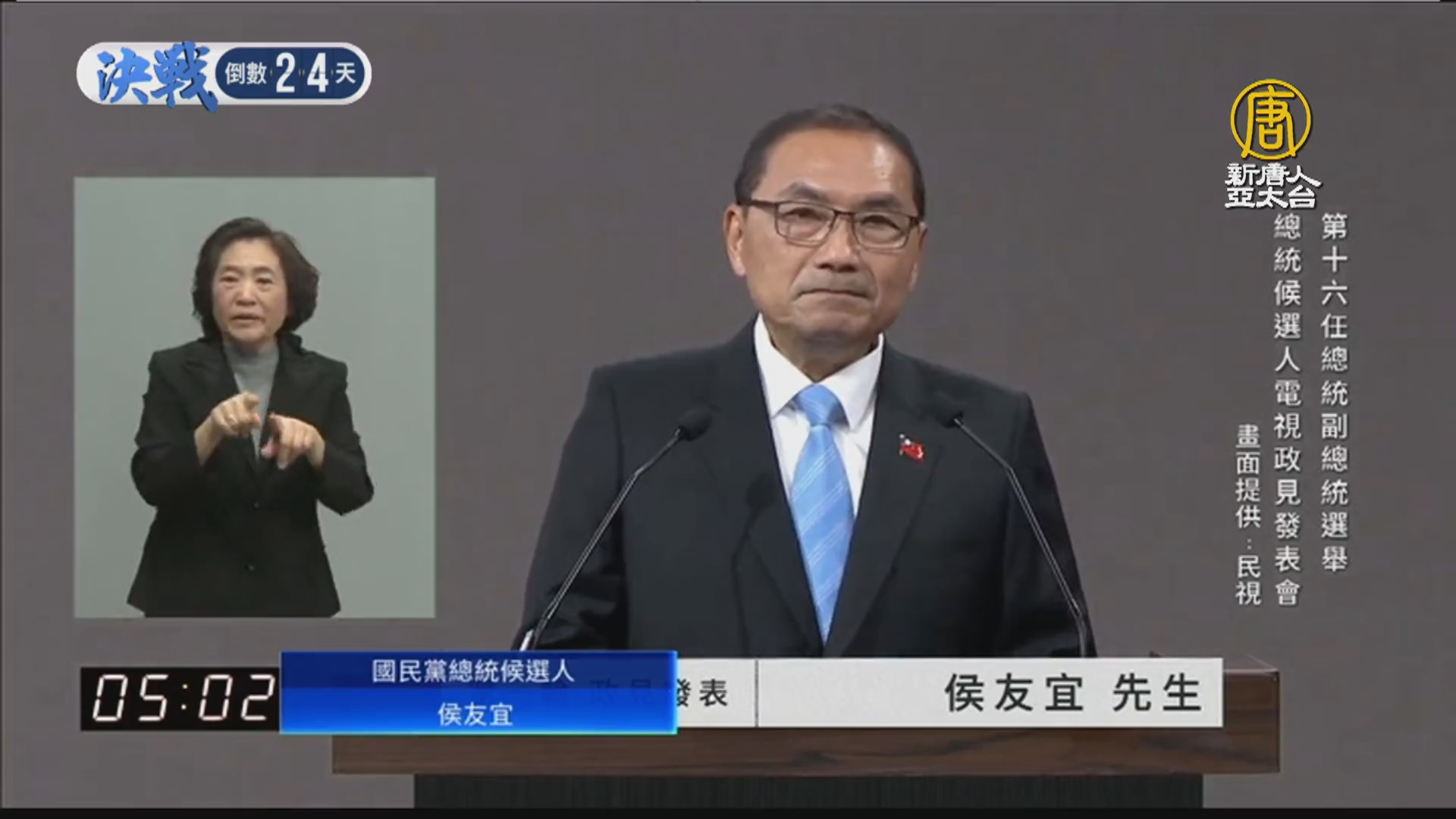 【新唐人亞太台 2023 年 12 月 20 日訊】歡迎回來。選戰倒數24天,第一場總統候選人電視政見發表會,國民黨侯友宜、民進黨賴清德、民眾黨柯文哲同台交鋒,針對兩岸議題,侯友宜批評賴清德的兩岸路線,賴清德則反問,支持九二共識的人要如何守護中華民國,柯文哲則主張,對外台灣自主,對內聯合政府團結台灣。