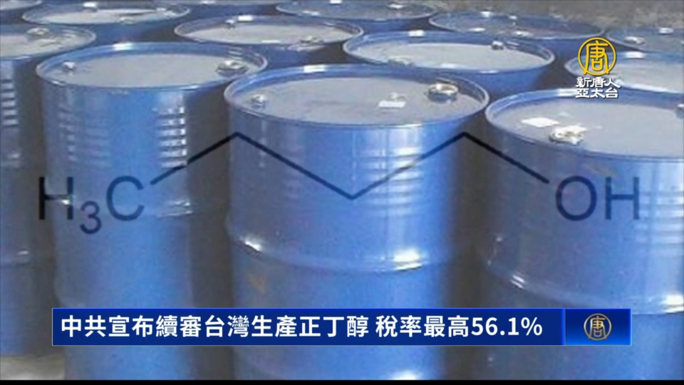 【新唐人亞太台 2023 年 12 月 22 日訊】中共先前單方面認定台灣構成貿易壁壘,本周中止12項CFA早收清單關稅優惠後,再度宣布,對台灣生產正丁醇,徵收反傾銷稅,相關措施發起為期一年「期終復審調查」,調查期間,除了台塑公司稅率為6%,其餘公司稅率最高56.1%,正丁醇(Butan-1-ol)主要用於生產下游化學產品,廣泛用於塗料與黏著劑,影響仍待觀察。