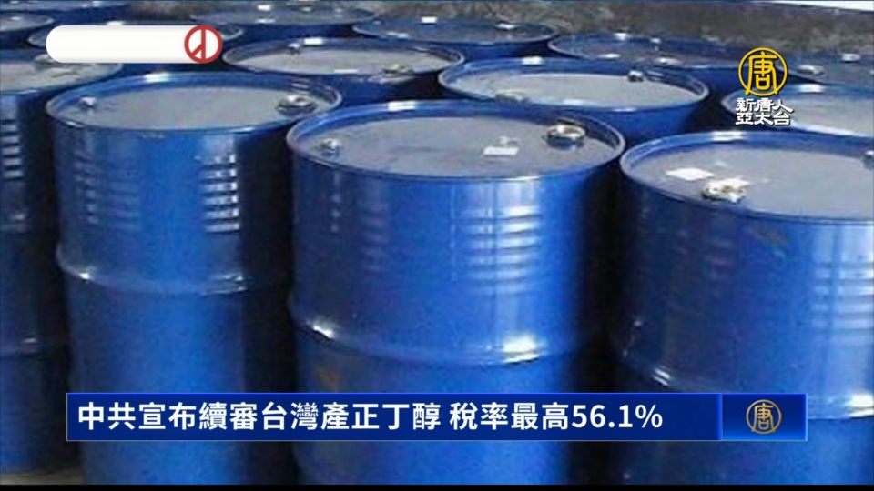 【新唐人亞太台 2023 年 12 月 22 日訊】中共連連出招經貿干預,15日突然違反WTO規範、片面對台灣扣上所謂構成貿易壁壘,21日突然中止12項ECFA早收清單關稅優惠,今天22日又宣布,對台灣生產的正丁醇,徵收反傾銷稅,相關措施發起為期一年「期終復審調查」,調查期間,除了台塑公司稅率是6%,其餘公司稅率最高達到56.1%。