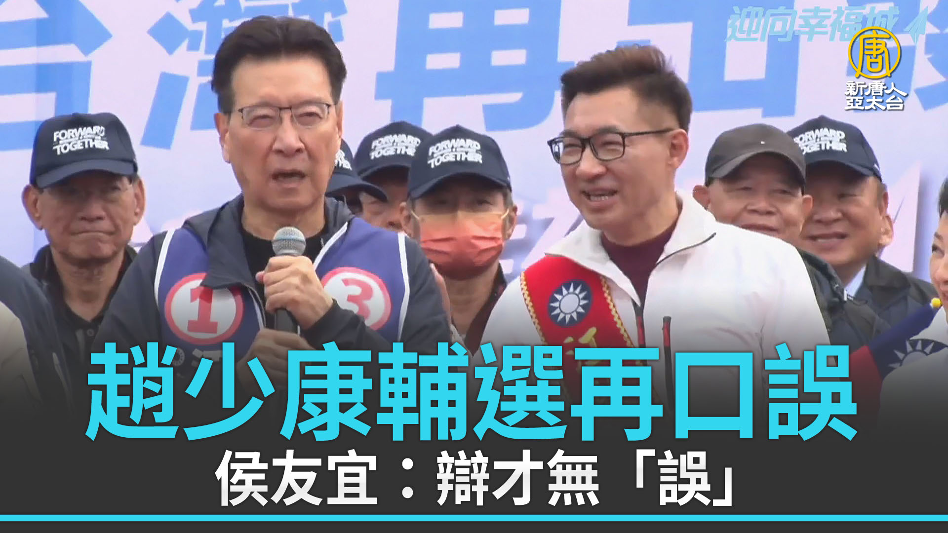 【新唐人亞太台 2023 年 12 月 23 日訊】選戰到數,國民黨副總統侯選人趙少康頻頻口誤,今天(23日)幫江啟臣站台,口誤稱江啟臣是台灣和平的恐怖份子。侯友宜則是將稱讚趙少康的詞「辯才無礙」,說成「辯才無誤」。
