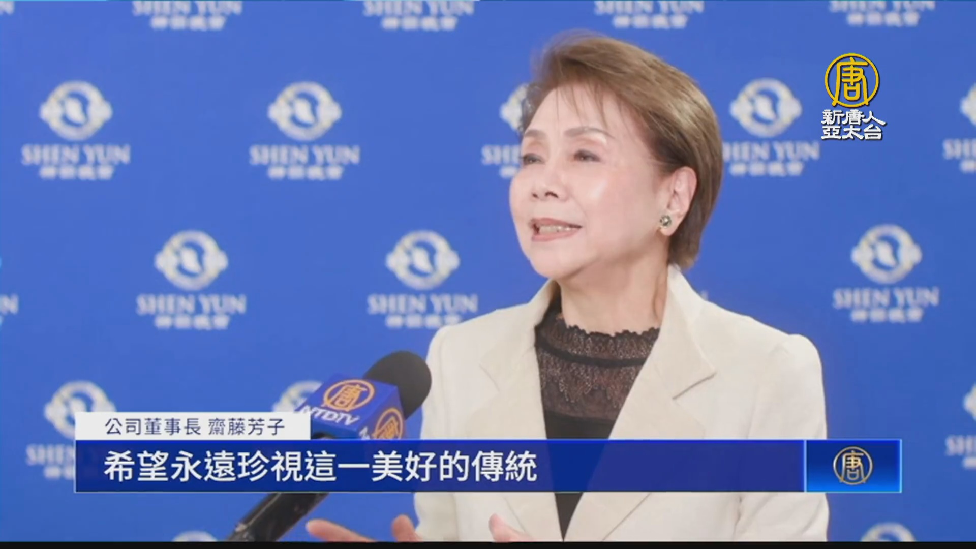 公司董事長齋藤芳子:「中國的傳統文化代代相傳,希望永遠珍視這一美好的傳統,希望日本人也同樣將我們自己的文化傳統傳承下去。不僅是中國,我們日本人(向神韻)學習的地方也很多。」