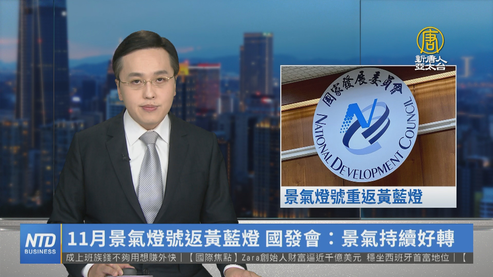 【新唐人亞太台 2023 年 12 月 27 日訊】國發會今天(27日)公布11月景氣燈號,綜合判斷分數大增4分,擺脫10月的低迷藍燈,轉向黃藍燈。國發會指出,出口轉好、內需維持熱絡,加上景氣領先指標跌幅縮小、同時指標維持上升,顯示國內景氣持續好轉。