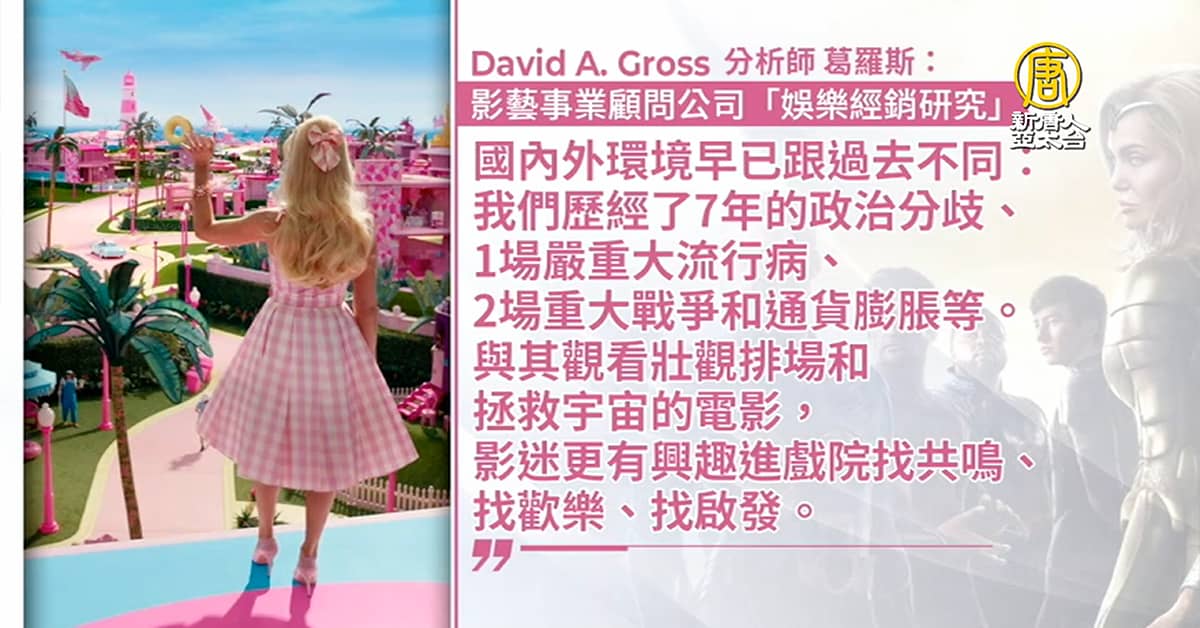 【新唐人亞太台 2023 年 12 月 27 日訊】以往超級英雄,是戲院座無虛席的票房保證,不過今年卻跌破大家眼鏡,年度票房冠軍,由電影芭比拿下。影評認為,經歷疫情、戰爭,改變民眾觀影心境。