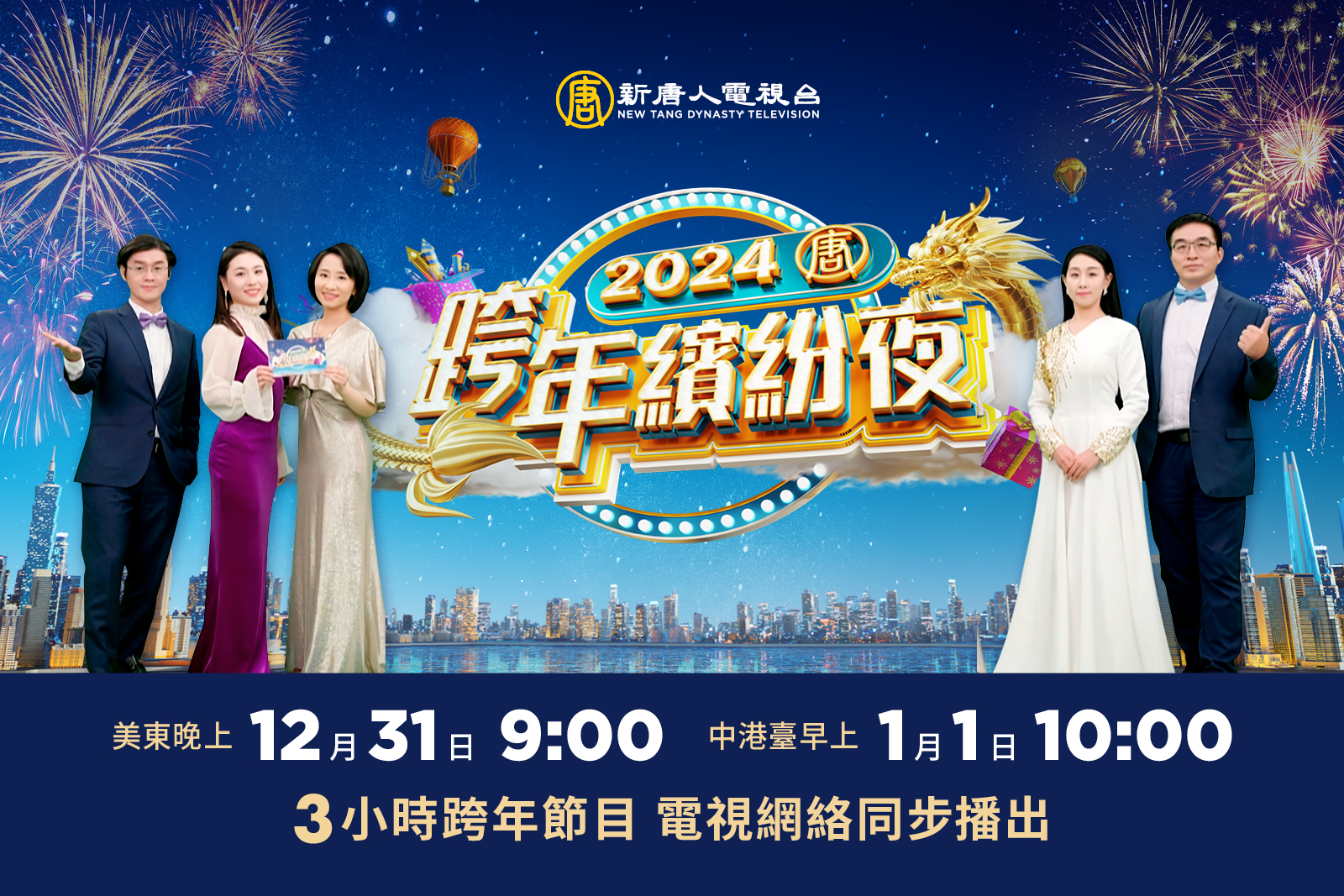 新唐人電視台特別企劃《2024跨年繽紛夜》,三小時特別節目,美東12月31日(週日)晚9點開始,陪您歡喜迎新年。(新唐人電視台)