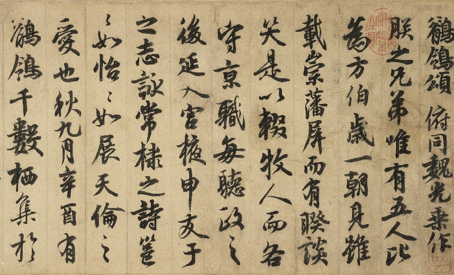 鄭淑方指出,本檔重量鉅作首推文化部2012年公告為國寶的唐玄宗現存唯一傳世墨跡〈鶺鴒頌〉,除講述兄弟間的友愛天倫,豐腴遒勁的字體也展現了時代的風格;元代趙孟頫及管道昇夫婦皆精書畫,本次展出重要古物《趙孟頫趙氏一門法書》,從其中〈南還帖〉、〈醉夢帖〉及〈兩書帖〉三帖,趙孟頫向中峰禪師傾吐妻子過世後的悲傷情緒,可知兩人鶼鰈情深。