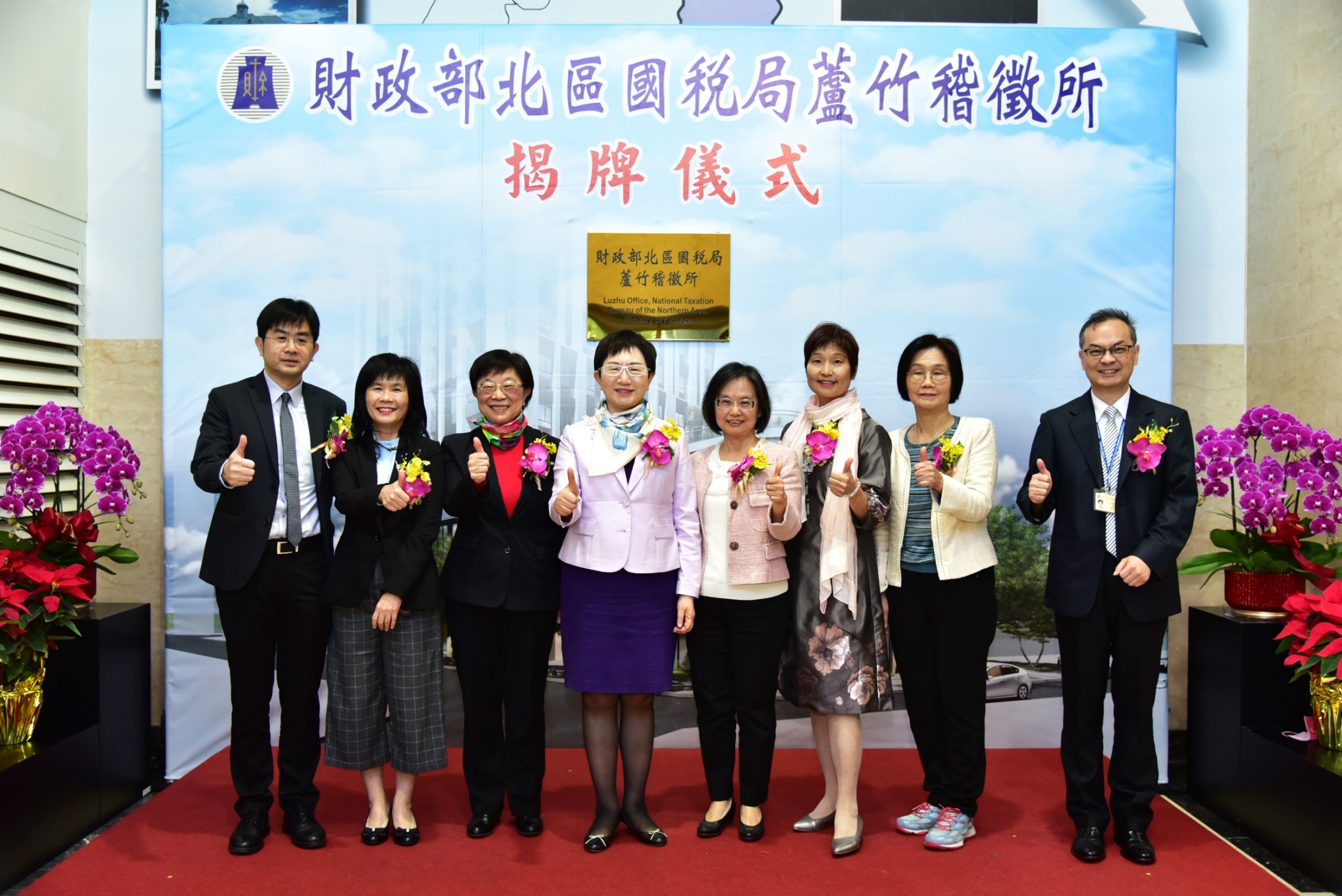 北區國稅局蘆竹稽徵所成立,財政部長莊翠雲(左四)主持揭牌儀式。(北區國稅局提供)