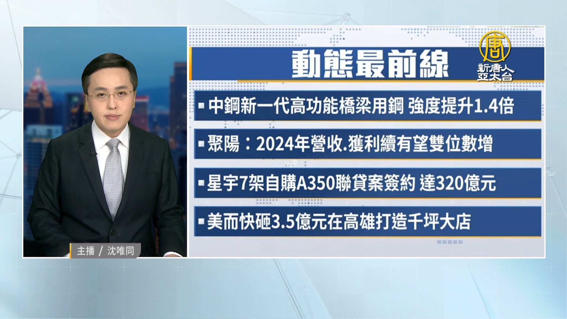 【新唐人亞太台 2024 年 01 月 03 日訊】帶您看到今天的產業動態。中鋼宣布研製新一代高功能橋梁用鋼,強度提升1.4倍,能達成橋梁輕量化,提升安全性,適用免預熱銲接,幫助台灣鋼結構橋梁升級;紡織大廠聚陽預估2023年EPS有望達16到17元水準,再創歷史新高。展望2024年,在日系客戶下單強勁、美系客戶訂單復甦下,預估營收將持續成長,整體營收、獲利皆有望較2023年雙位數成長;星宇航空7架自購A350廣體客機聯貸案,今天(3日)正式簽約,總金額新台幣320億元。包含3架A350-900及4架A350-1000,預計2024年第四季陸續交機;服飾電商業者美而快與中石化,完成高雄亞洲新灣區約3000坪土地租賃契約簽署,預計投入3.46億元打造上千坪的獨立大店,將是美而快全台最大旗艦店。