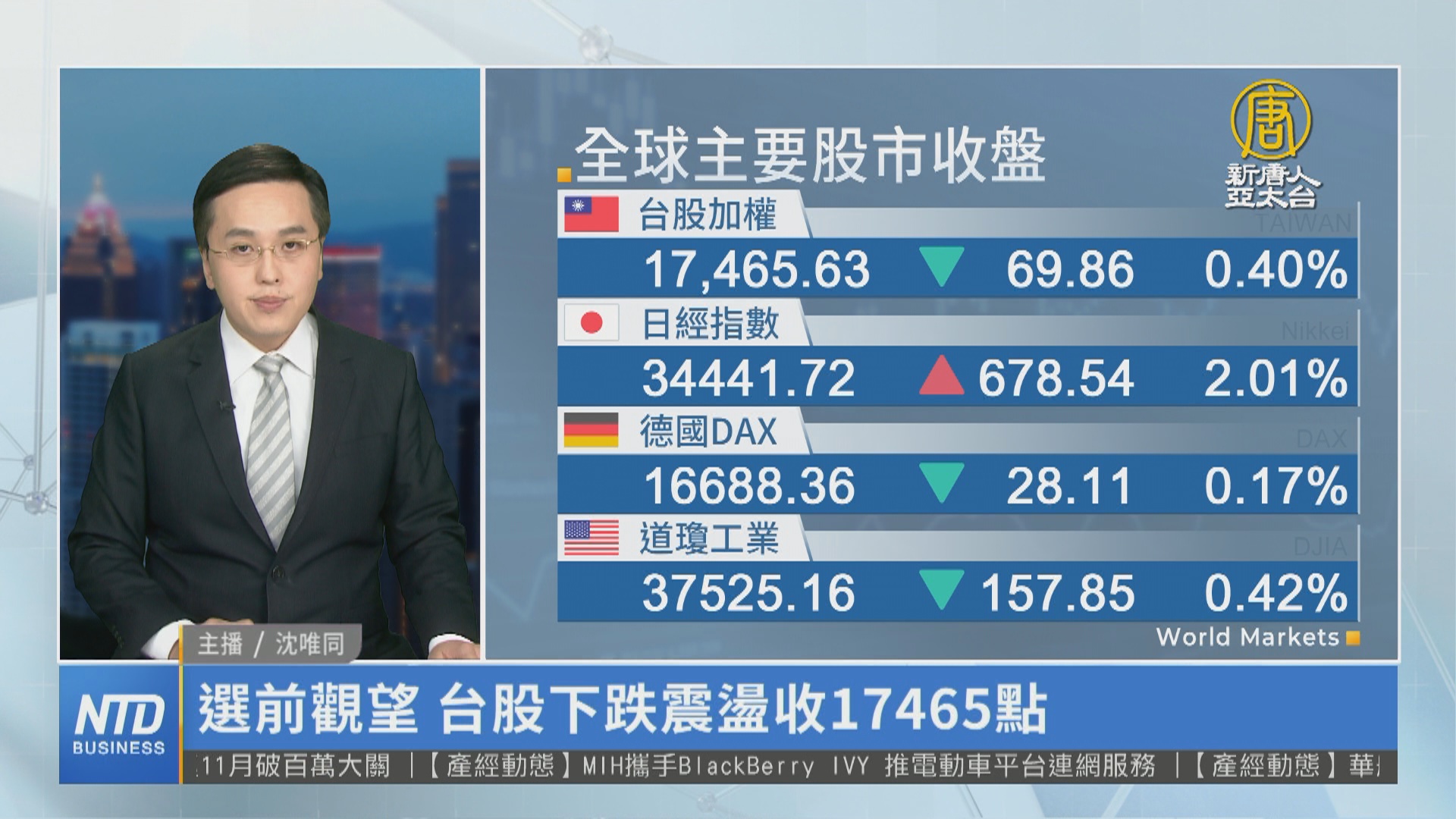【新唐人亞太台 2024 年 01 月 10 日訊】新聞一開始帶您關心國際股市,美股主要指數,週二 (9 日) 收盤漲跌不一。投資人靜待關鍵通膨數據,能源與金融股領跌之下,道瓊指數下跌160 點,標普也收黑。台股方面,選前觀望氣氛持續加重,儘管部分 AI PC 逆勢撐盤,不過電子類股走弱,貨櫃三雄再度下跌,指數開低震盪,終場下跌69.86點,收在17465.63點,三大法人賣超 38.85 億元。法人分析,總統大選前資金逢高減碼,散戶權證偏空、外資期貨空單避險水位上升,預料選後市場回歸基本面。