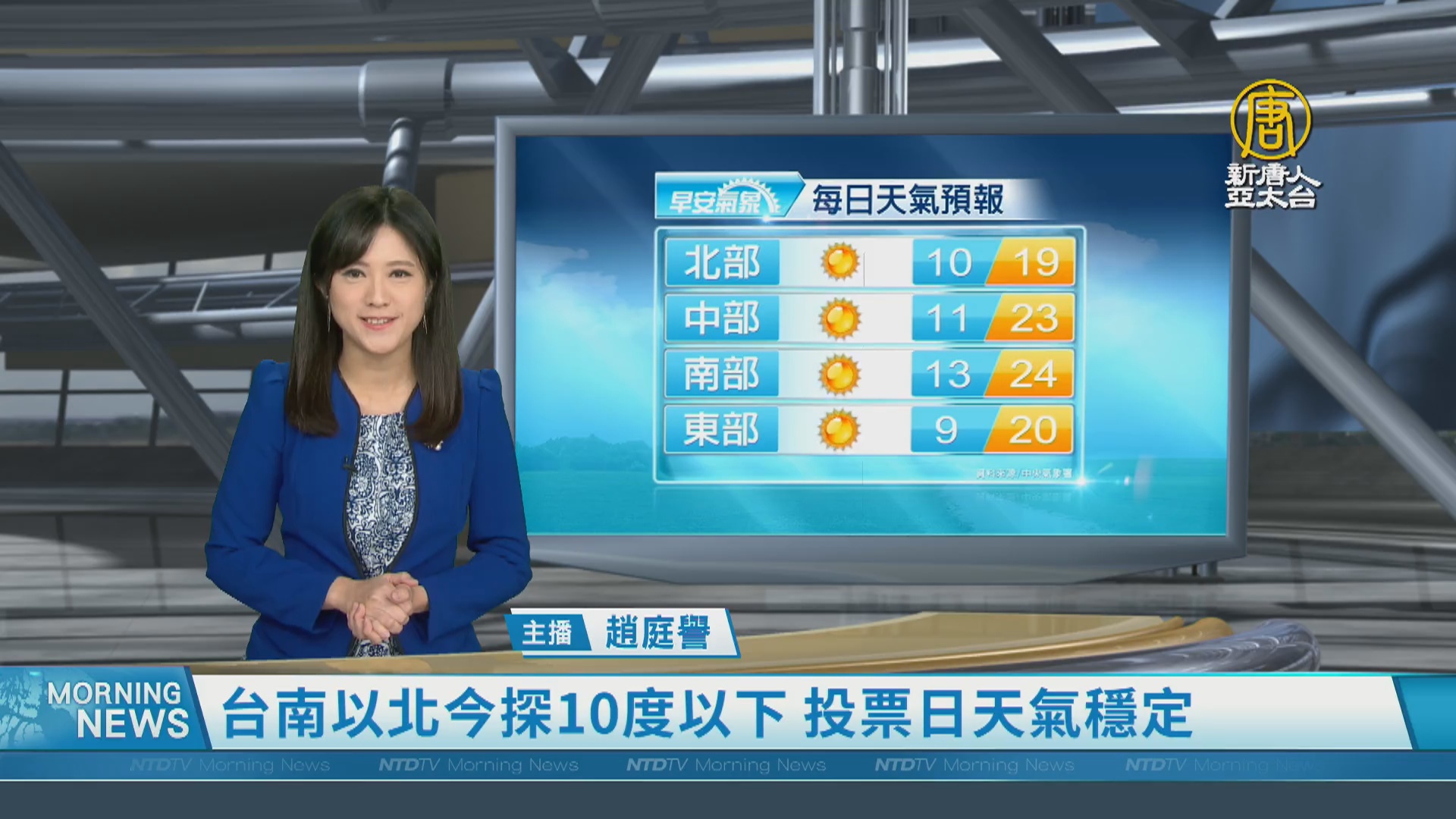 【新唐人亞太台 2024 年 01 月 11 日訊】歡迎您收看1月11日的早安新唐人,我是趙庭譽,先來帶您關心天氣。受到冷氣團及輻射冷卻影響,各地偏冷,台南以北,可能局部有攝氏10度以下低溫;明天白天冷氣團減弱,週六投票日(13日)天氣相對穩定。帶您一起來看到國際媒體重要訊息。