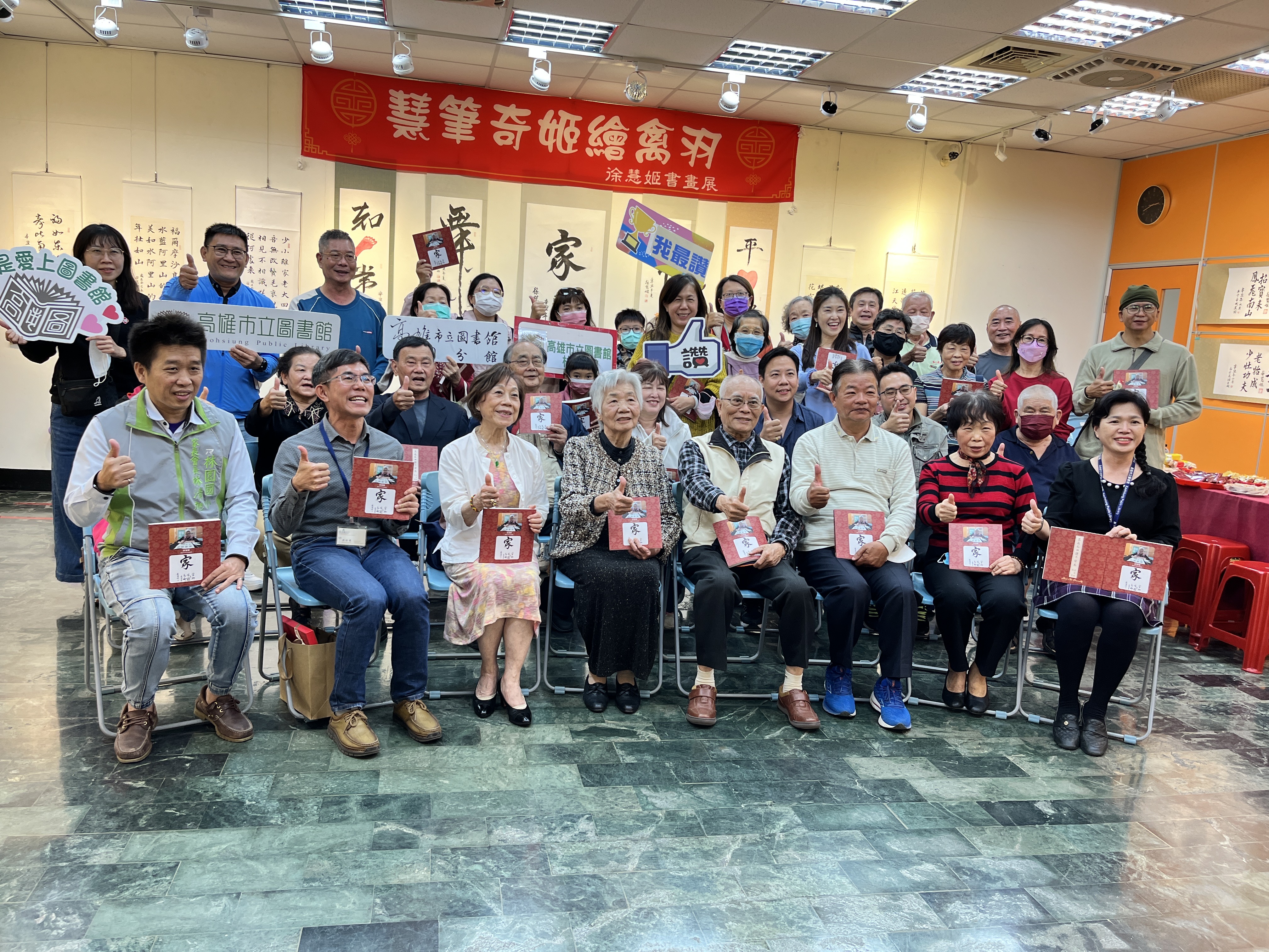 開幕式大合照,徐慧姬第一排左4,林園國小校長洪琮琪第一排左2。(林園圖書館提供)