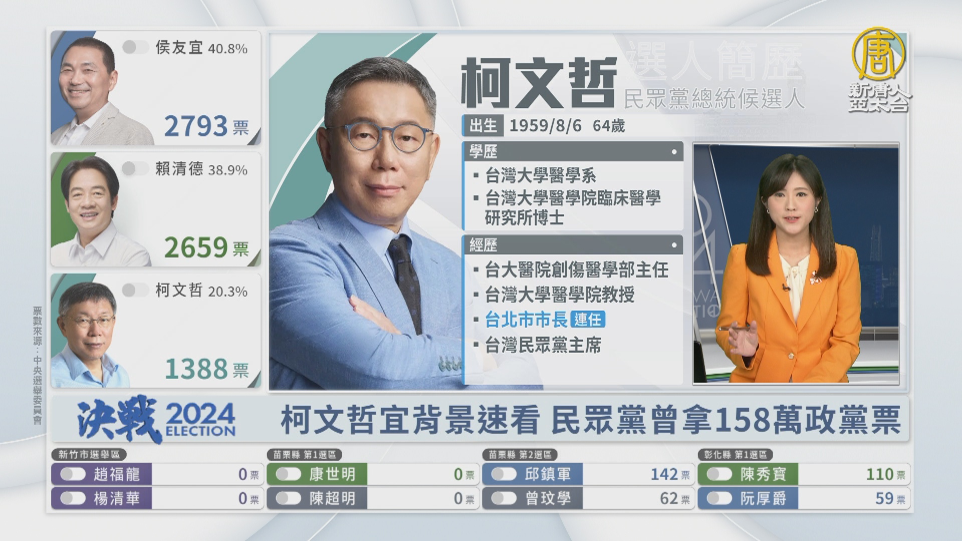 【新唐人亞太台 2024 年 01 月 13 日訊】再來看到,民眾黨總統候選人柯文哲,64歲,台大醫學系畢業,行醫25年後,2014年,在民進黨支持下,以無黨籍身分打敗對手,成功選上台北市長,之後又取得連任,值得注意的是,他在2019年創立民眾黨,主打超越藍綠的第三勢力,2020年,民眾黨曾拿下158萬張的政黨票。