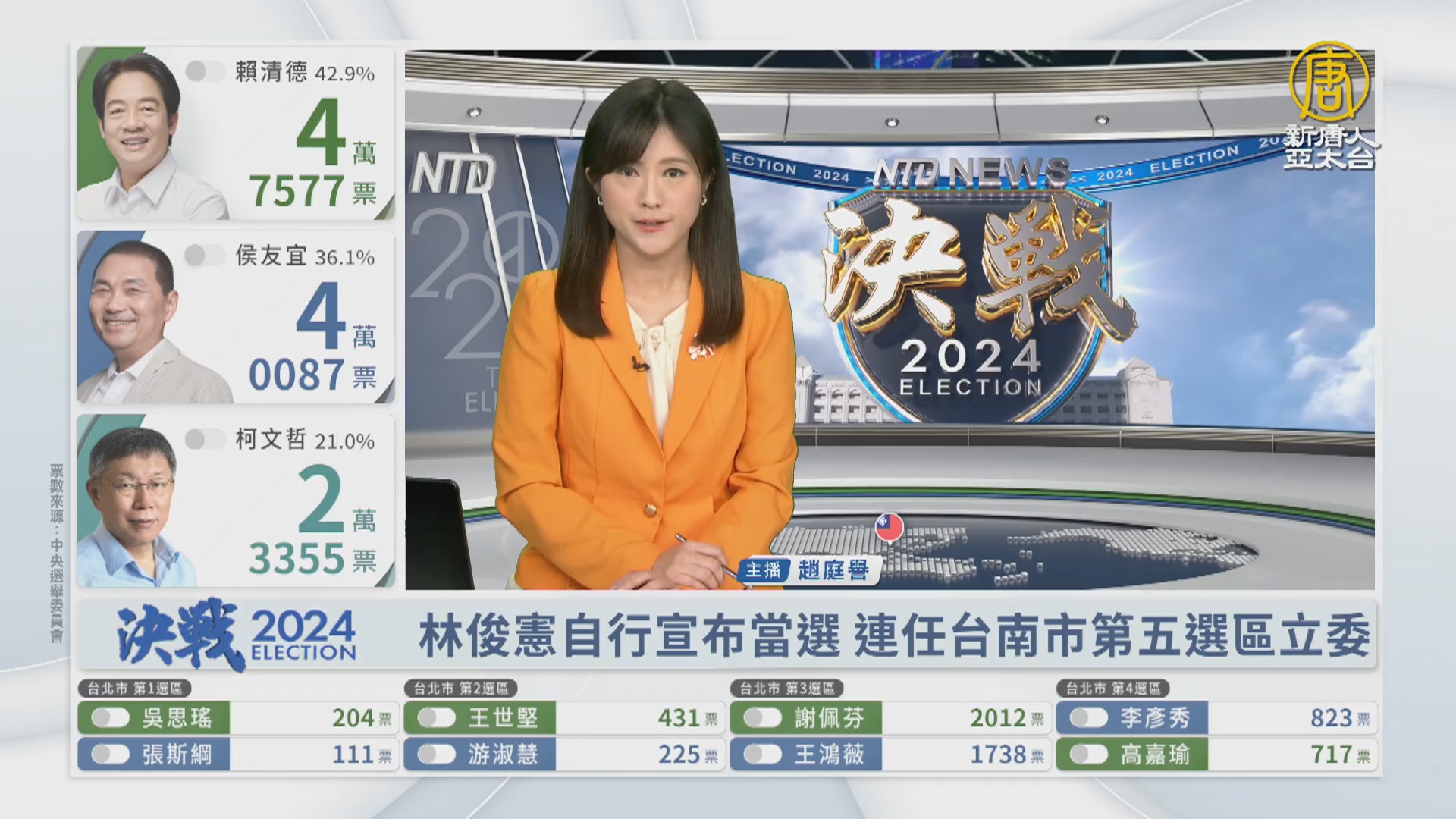 【新唐人亞太台 2024 年 01 月 13 日訊】民進黨台南市立委林俊憲稍早自行宣布順利連任,打敗唯一對手蕭燐洪。原本國民黨提名王家貞競選該選區立委,卻因資格不符,登記後無法成為候選人。也讓林俊憲順利當選。