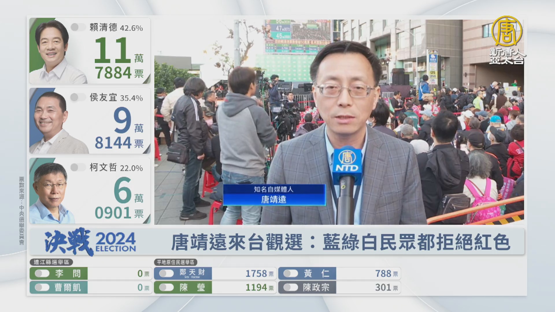 【新唐人亞太台 2024 年 01 月 13 日訊】全球華人知名自媒體人,這幾天都聚集台灣觀選,我們訪問正在開票晚會現場的時事評論員唐靖遠,請教他對台灣選民的表現,有甚麼樣的觀察?
