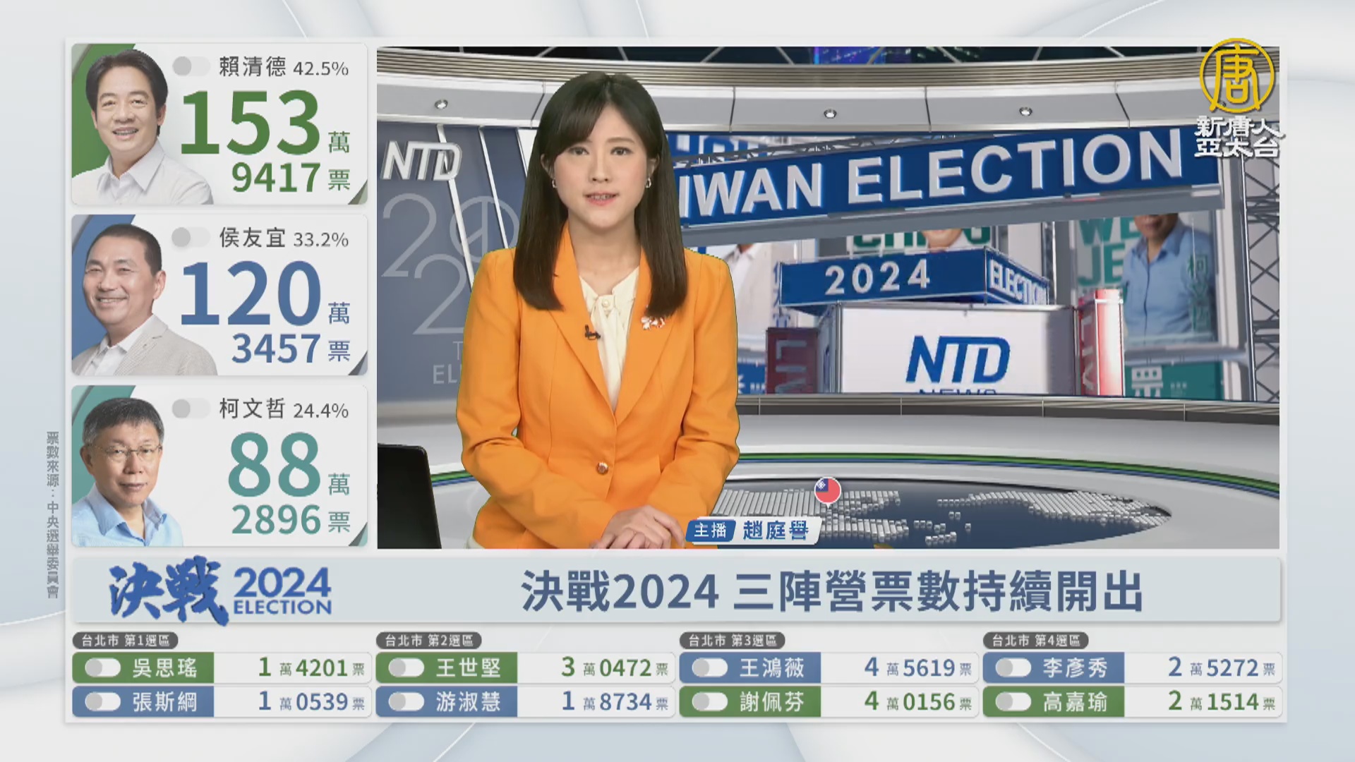 【新唐人亞太台 2024 年 01 月 13 日訊】好,目前投票結束已經一個小時,來看到最新開票情況,。現場三個陣營持續湧入支持者,等待票數開出,我們記者也在三個陣營為您守候。