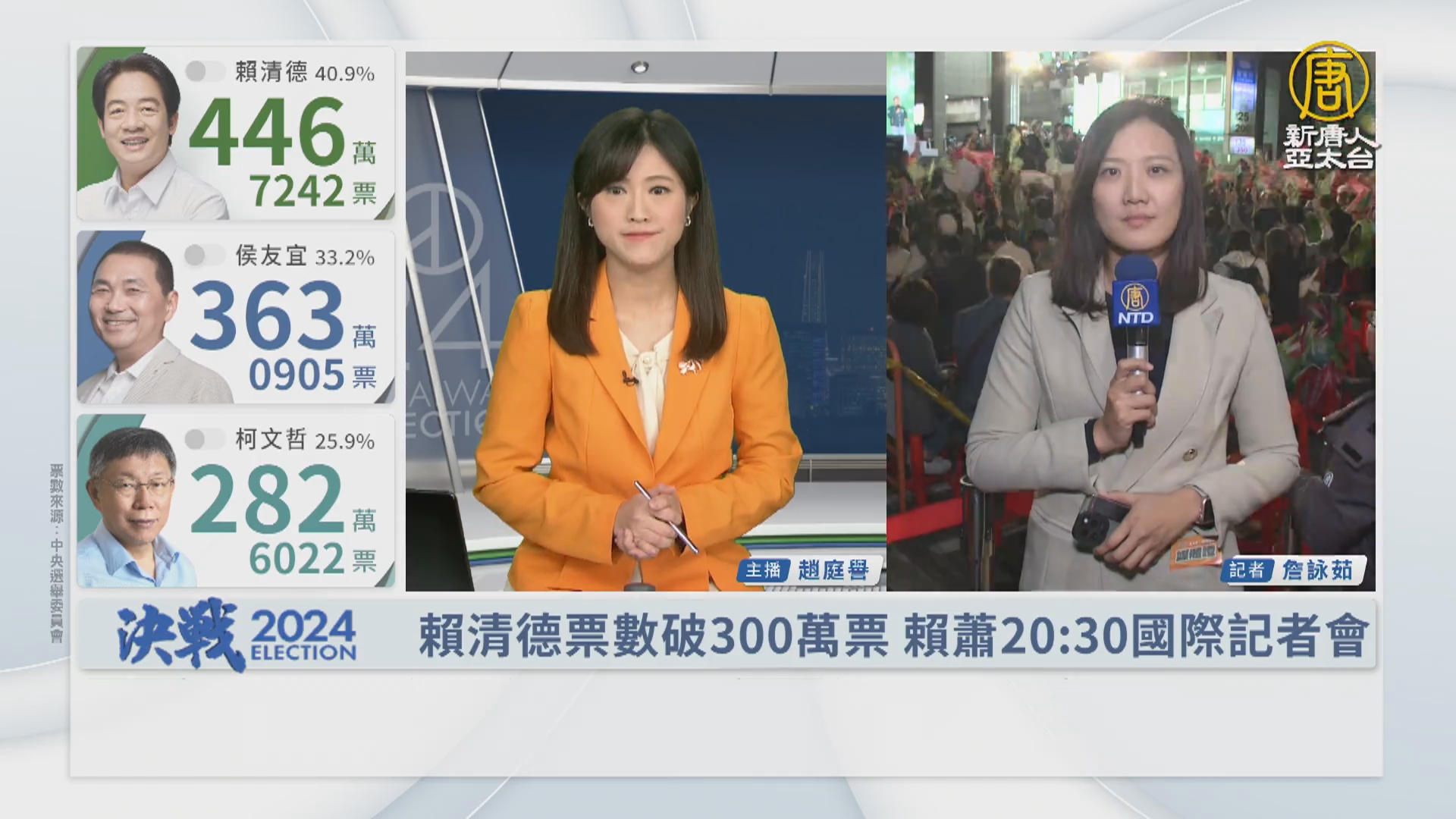 【新唐人亞太台 2024 年 01 月 13 日訊】民進黨正副總統候選人賴清德、蕭美琴,目前是處於穩定領先態勢,將在晚間7點半抵達競選總部。而在選舉結果確定後,賴清德預計將在晚間8點半召開國際記者會。馬上請人在賴清德競選總部的記者詹詠茹,帶來最新說明,詠茹。