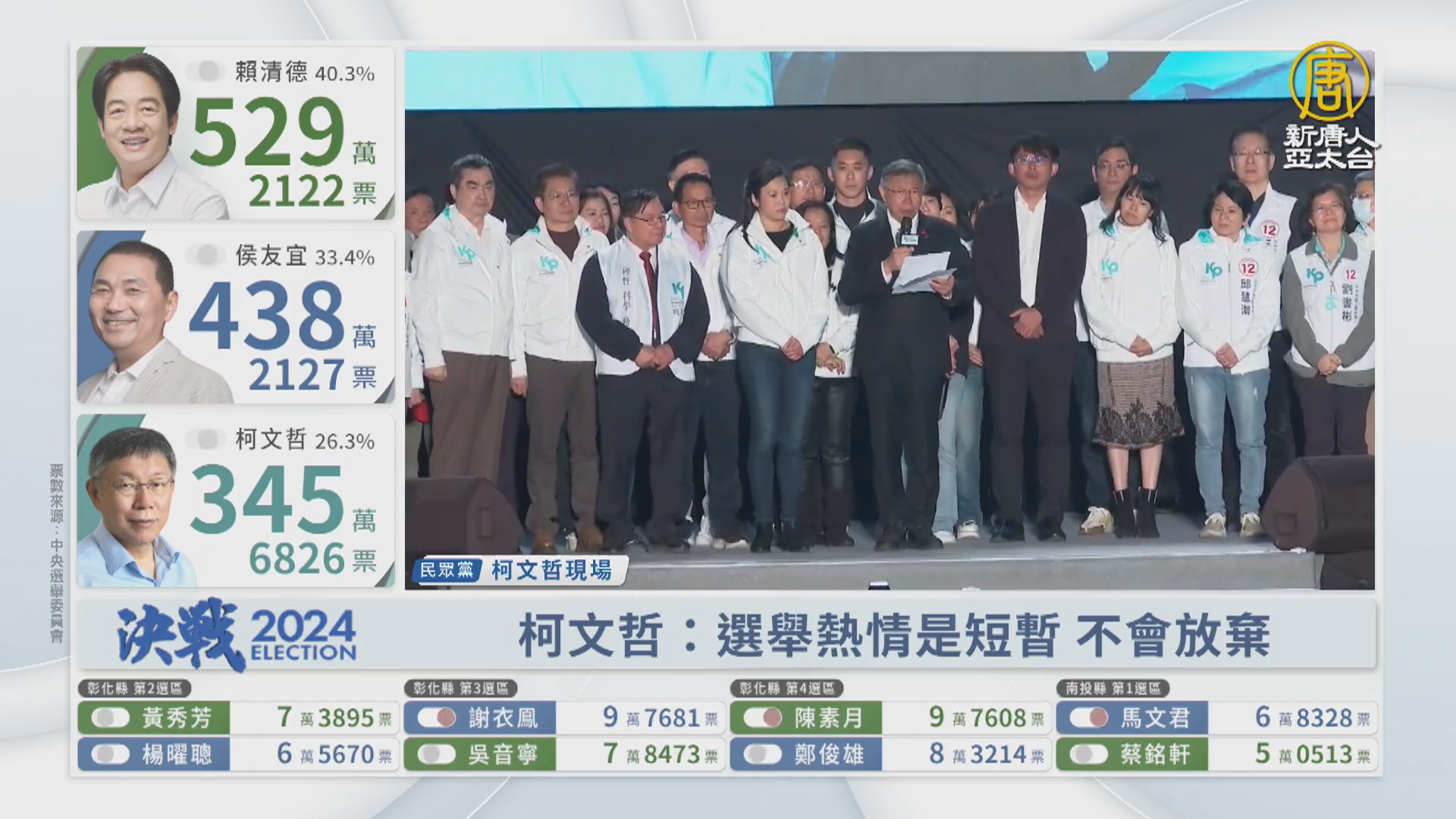 【新唐人亞太台 2024 年 01 月 13 日訊】民眾黨總統候選人柯文哲稍早已經發表敗選感言,他表示,選舉熱情是短暫,不會放棄。他說政治的良心,也是人民可以依賴的力量,來看到,柯文哲稍早的發言。