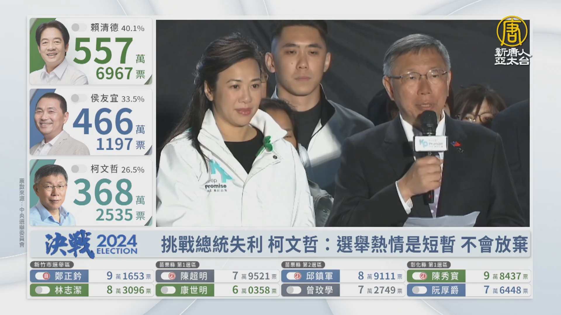 【新唐人亞太台 2024 年 01 月 13 日訊】民眾黨總統候選人柯文哲稍早已經發表敗選感言,他表示,選舉熱情是短暫,不會放棄。他說政治的良心,也是人民可以依賴的力量,來看到,柯文哲稍早的發言。