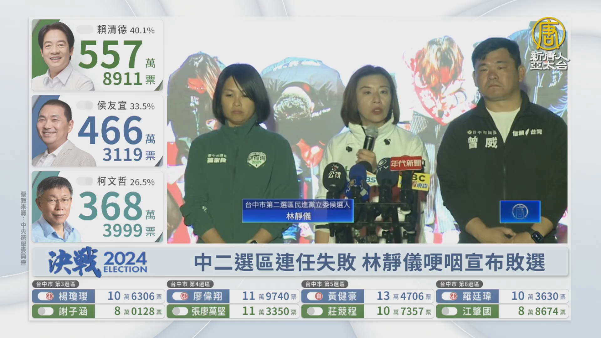 【新唐人亞太台 2024 年 01 月 13 日訊】台中市第2選區立委選戰,現任的民進黨立委林靜儀,與國民黨顏寬恒兩人再度對決,在2022年立委補選中,林靜儀贏了近八千票,顏寬恒今年捲土重來,傍晚宣布以11萬8962票勝選,林靜儀也哽咽宣布敗選。