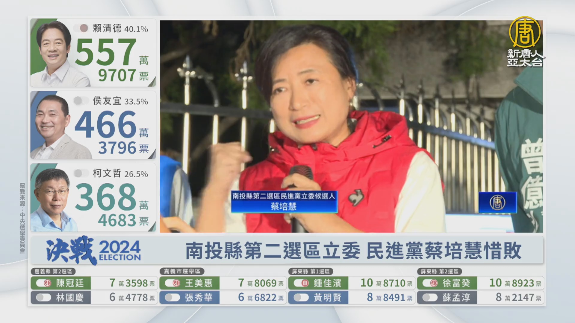 【新唐人亞太台 2024 年 01 月 13 日訊】南投縣第二選區立委選舉,民進黨候選人蔡培慧連任失敗,晚間七點以微幅落後3000票,發表敗選感言。