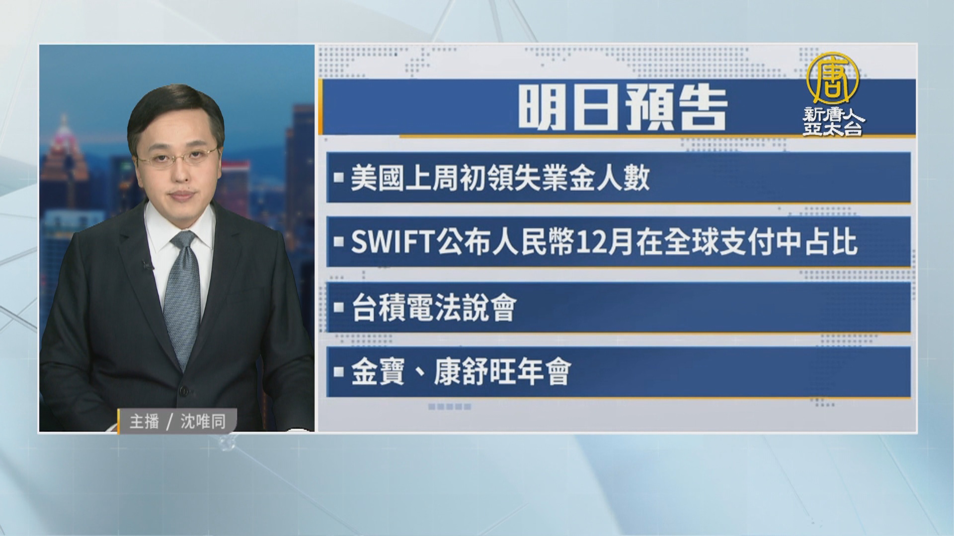 【新唐人亞太台 2024 年 01 月 17 日訊】帶您看到明天,1月18日,星期四,有哪些重要的財經活動。 美國上周初領失業金人數、SWIFT公布人民幣12月在全球支付中占比、台積電法說會、金寶、康舒旺年會。