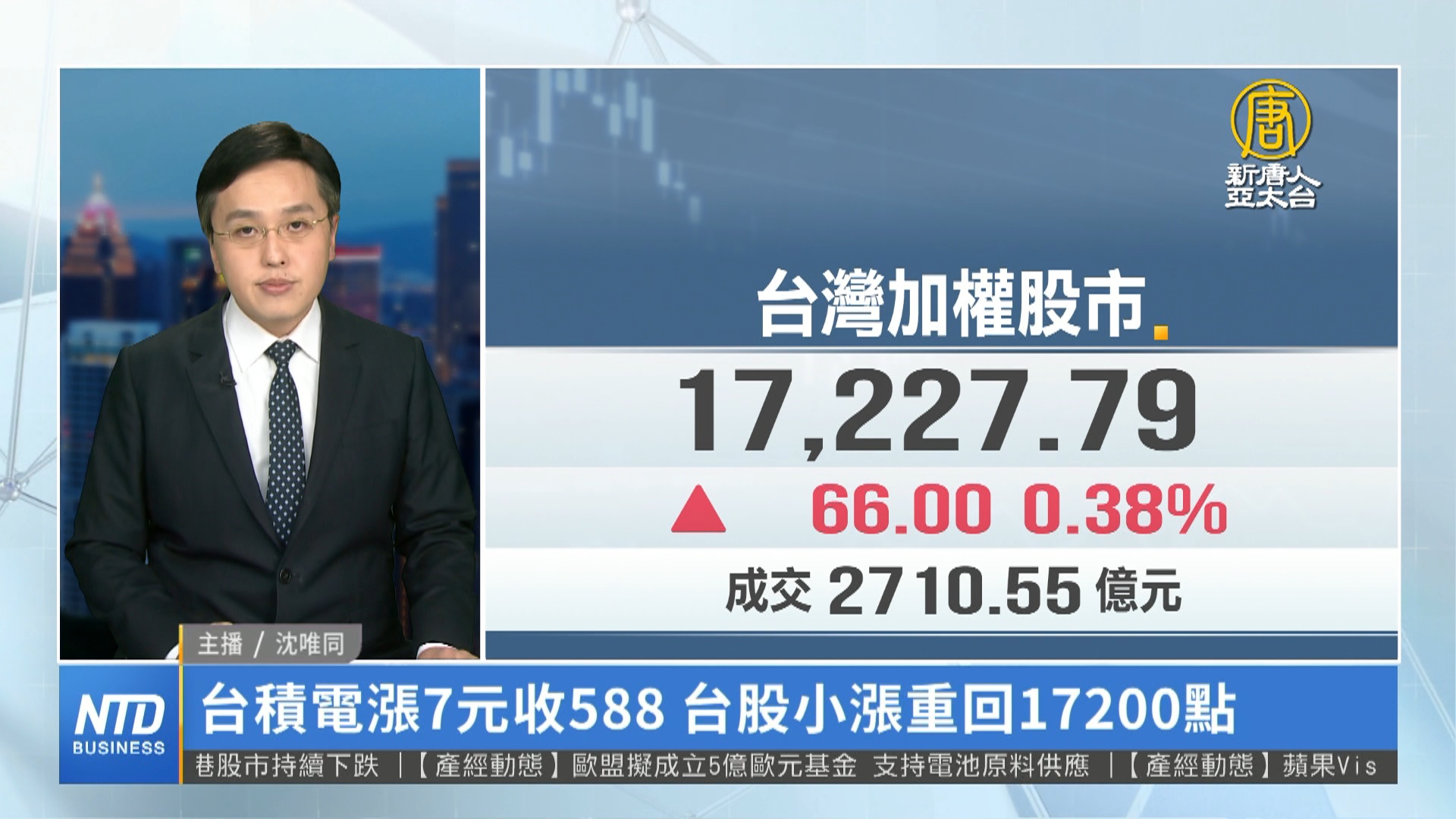 【新唐人亞太台 2024 年 01 月 18 日訊】美國零售銷售數據走強,削減市場對於聯準會3月降息的預期,美股主要指數週三收黑。台股在台積電為首的電子權值撐盤下,終場上漲66點,收在17227.79點,台積電法說前夕,股價收盤上漲7元。市場靜待台積電下午法說釋出的展望,也讓成交金額縮減,三大法人合計賣超 77.28 億元。