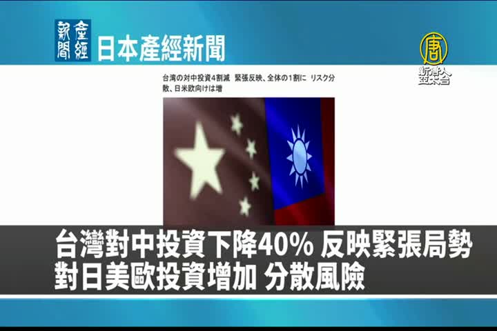 【新唐人亞太台 2024 年 01 月 25 日訊】來看到日本產經新聞報導:台灣對中國投資下降40%,反映緊張局勢;對日本、美國、歐洲投資則增加,分散風險。