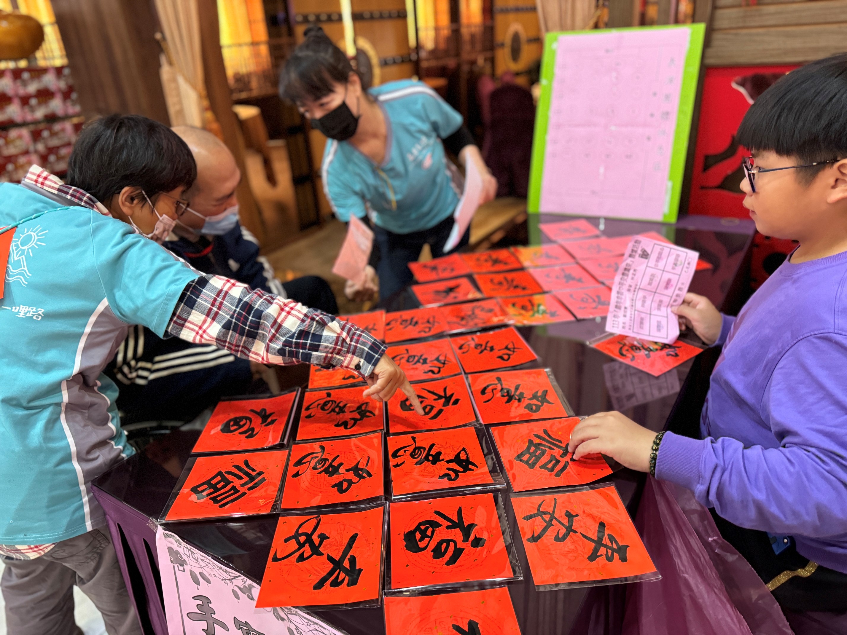 嘉基社工與照服員陪長輩們在年貨大街上挑春聯(嘉義基督教醫院提供)