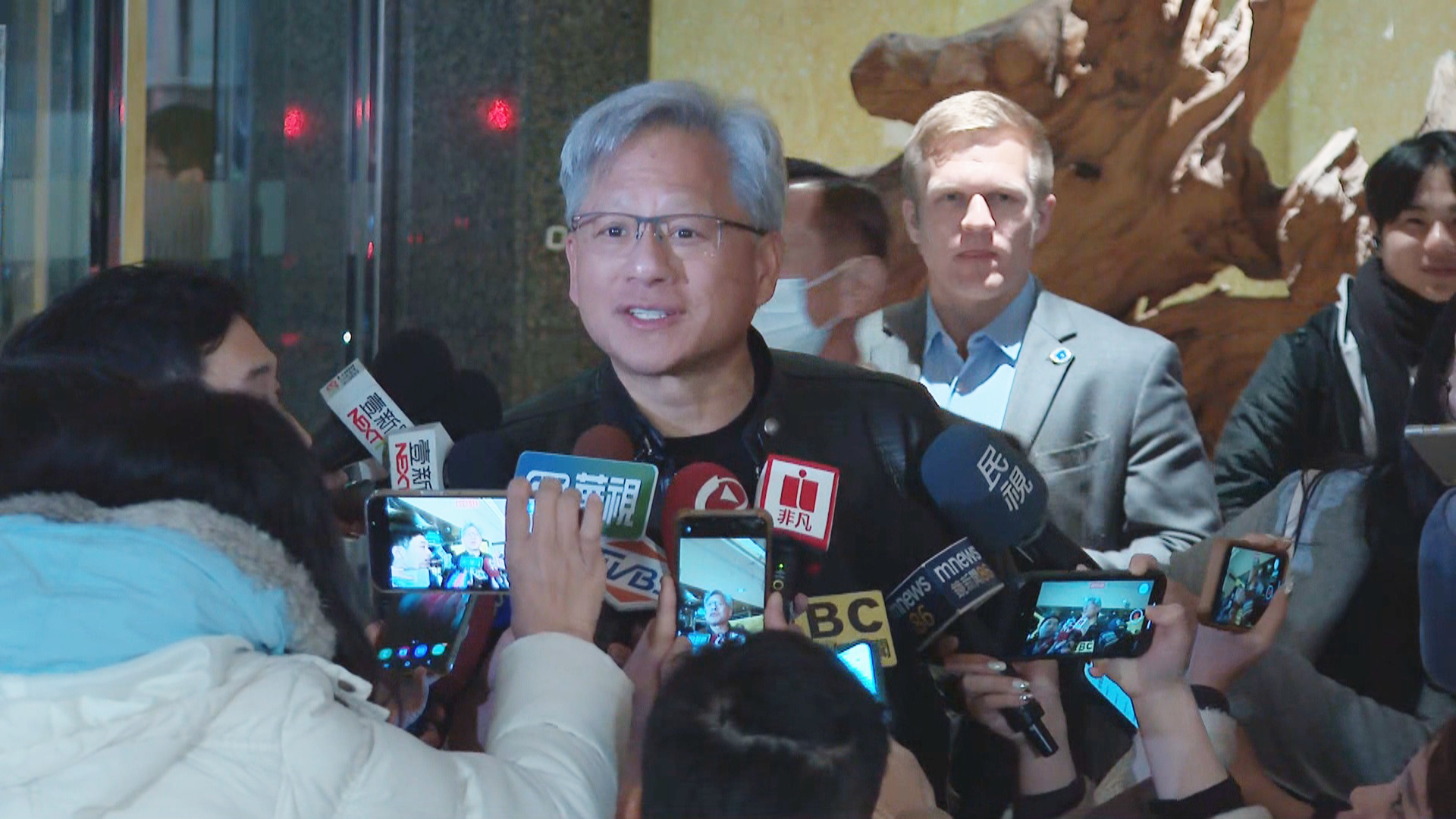 2025-01-18 20:29:39輝達執行長黃仁勳,今天(((18日)))中午宴請台灣供應鏈合作夥伴,超過30位董總出席,總市值超過新台幣百兆元。包括台積電董事長魏哲家、廣達董事長林百里、鴻海董事長劉揚偉等人。餐敘後,黃仁勳親自送魏哲家上車,兩人也接受媒體短暫訪問。
