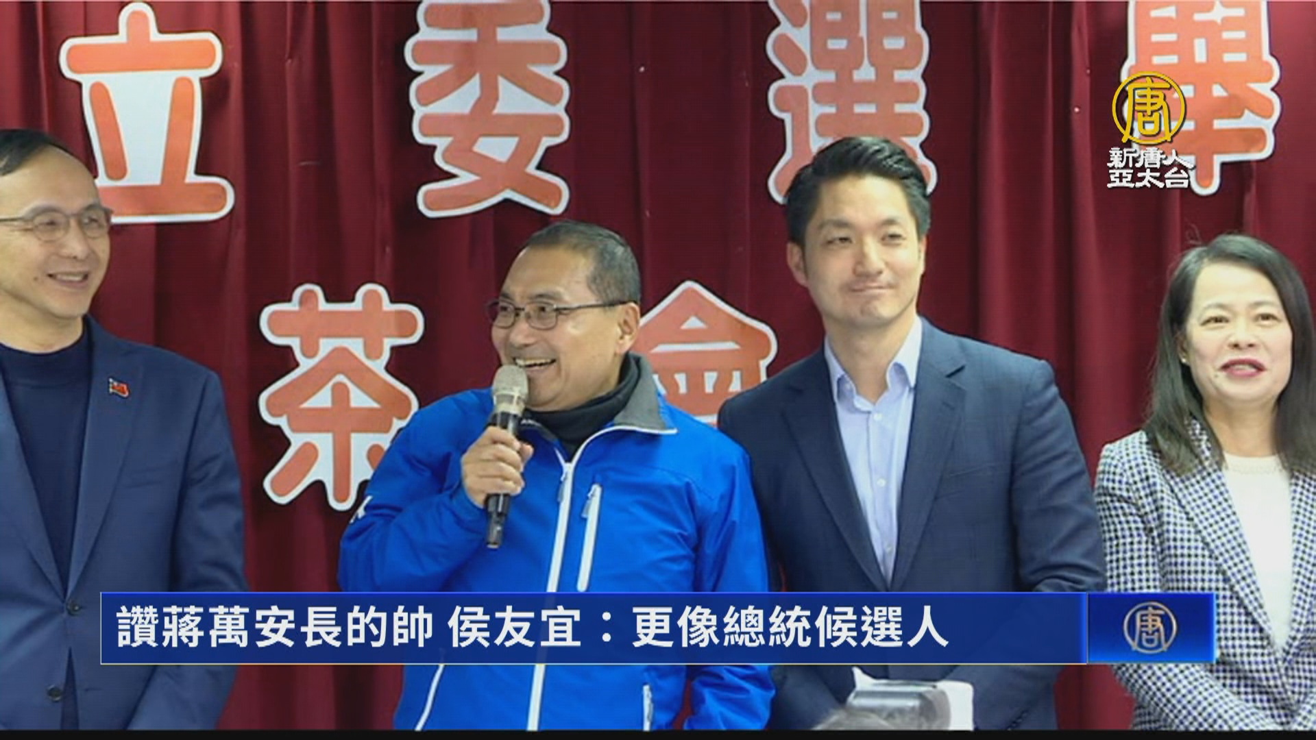 【新唐人亞太台 2024 年 01 月 27 日訊】選戰落幕,國民黨26日晚間在台北市舉辦感恩晚會,黨主席朱立倫陪同新北市長侯友宜一起出席,侯友宜還特別點名台北市長蔣萬安,幫他全台跑透透,長得帥、國語又講得好,比他更像總統候選人。
