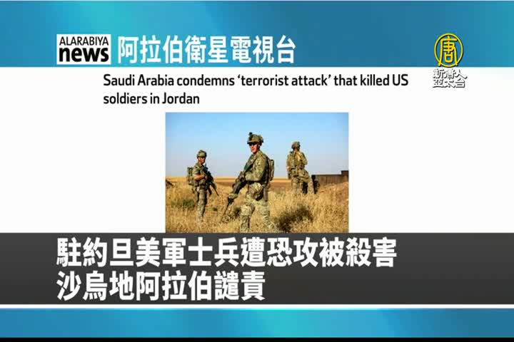 【新唐人亞太台 2024 年 01 月 30 日訊】來看到阿拉伯衛星電視台報導:駐約旦美軍士兵遭恐攻被殺害,沙烏地阿拉伯譴責。