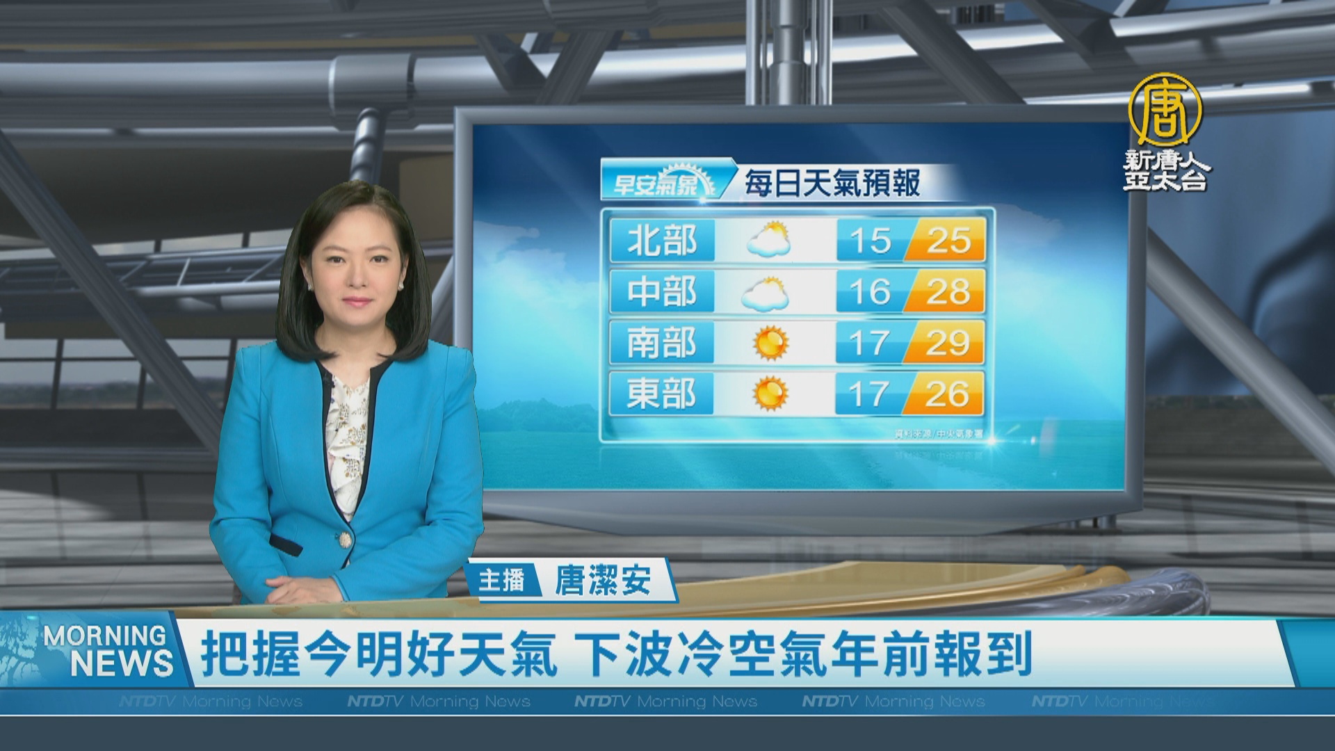 【新唐人亞太台 2024 年 01 月 31 日訊】歡迎您收看1月31日的早安新唐人,我是唐潔安,先來帶您關心天氣。把握今明好天氣,這兩天水氣相對少,只有東半部、恆春半島零星短暫雨,其他地區多雲到晴。不過,星期五東北季風稍微增強,降雨區域新增至北部地區。過年前將轉為比較濕冷的天氣型態,至於會不會達到冷氣團等級,氣象署說,還有待觀察。帶您一起來看到國際媒體重要訊息。