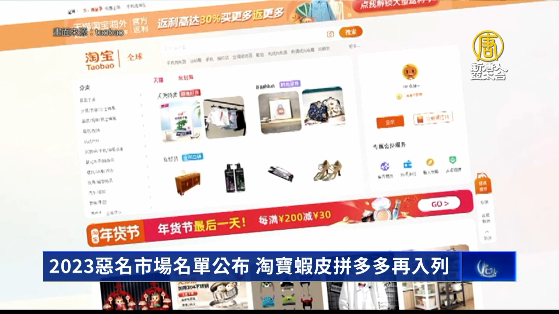 【新唐人亞太台 2024 年 01 月 31 日訊】美國貿易代表署30日公布,2023年販賣侵權產品的「惡名昭彰市場」黑名單。列出18國39個網路市場,與33個實體市場山寨盜版猖獗,中國繼續被列為世界上仿冒盜版的頭號來源地。包括淘寶、微信、拼多多、蝦皮等網路商城,以及華強北電子市場、北京秀水街7個實體市場,都再度被點名。美國貿易代表戴琪指出,今年的名單強調仿冒商品的潛在危險,以及強而有力的執法行動打擊這些商品貿易,對美國經濟成長非常重要。而台灣並未被點名。