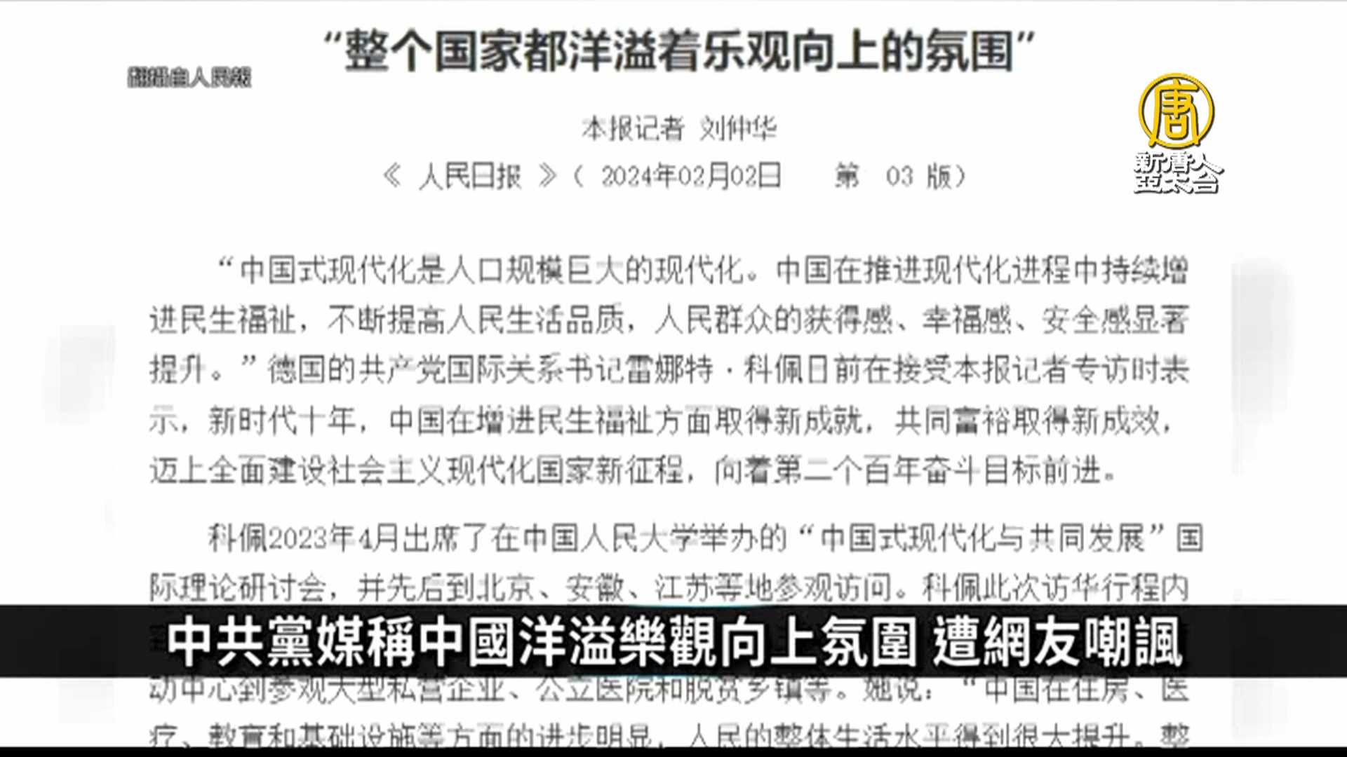 【新唐人亞太台 2024 年 02 月 03 日訊】中共黨媒稱中國洋溢樂觀向上氛圍 遭網友嘲諷
