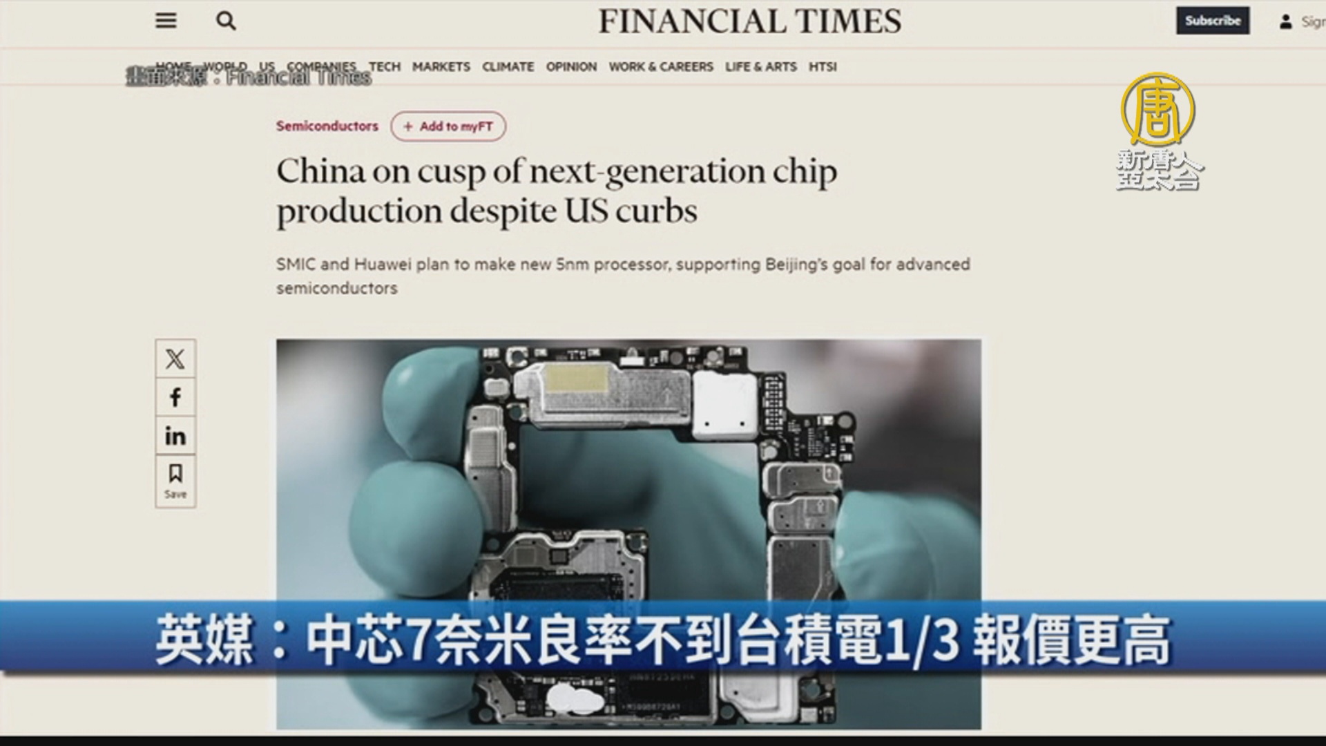 英國《金融時報》報導,中國晶圓代工廠中芯國際7奈米製程良率,不到台積電1/3,且因成本高昂,報價高於台積電40~50%。