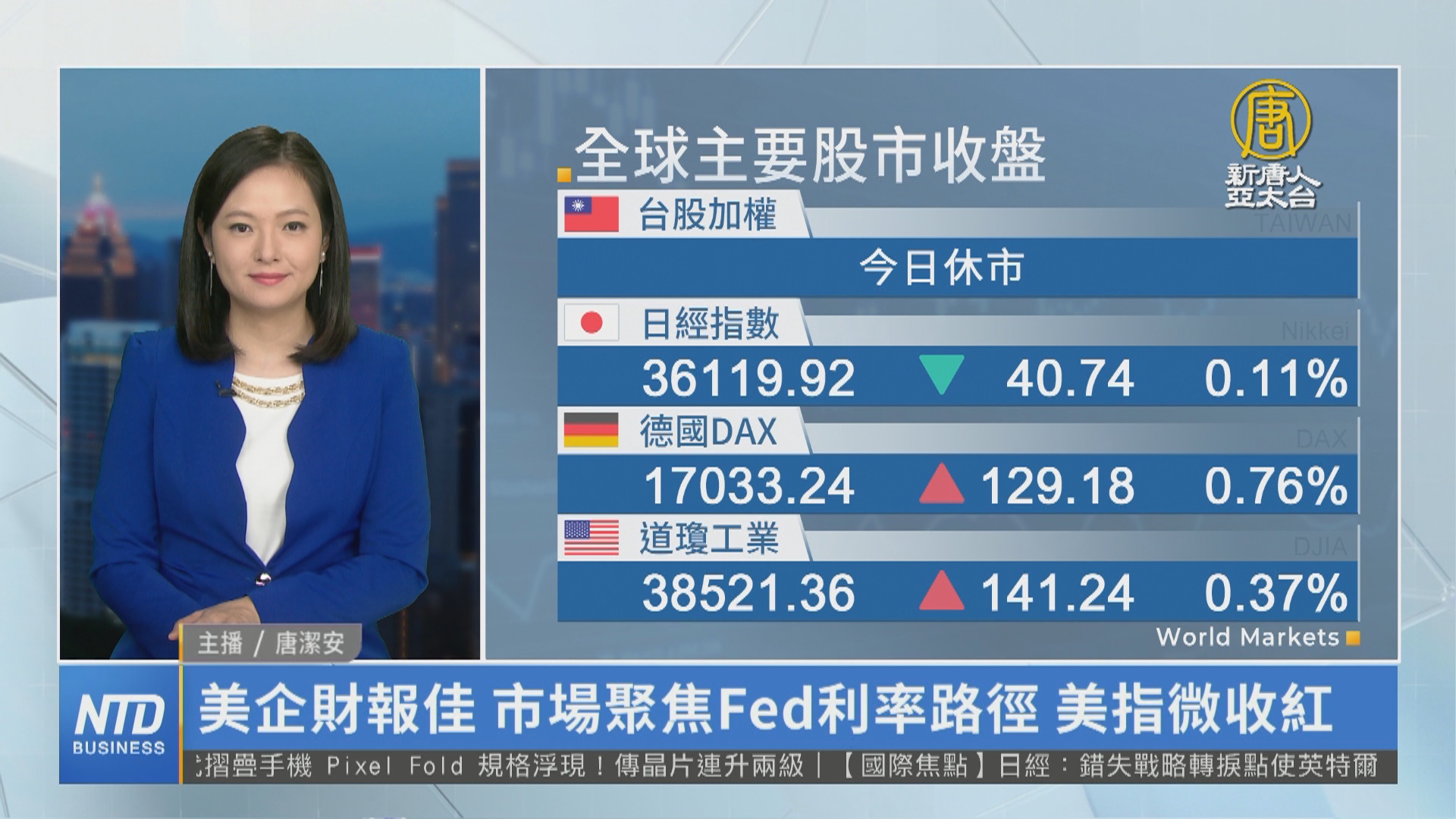 【新唐人亞太台 2024 年 02 月 07 日訊】新聞一開始帶您看到國際股市。隨著華爾街評估,最新一批企業財報和聯準會降息時間表,再次激勵市場信心,週二(6日)美股主要指數微幅收紅,道瓊走高140 點以上,標普微漲超過 0.2%,那指表現幾乎持平,費半下挫1.1%。高速晶片介面設計藍博士公司(Rambus)股價下挫19%、超微下挫3.64%,成為拖累指數的重心,輝達則是創高後回落,下挫1.61%。