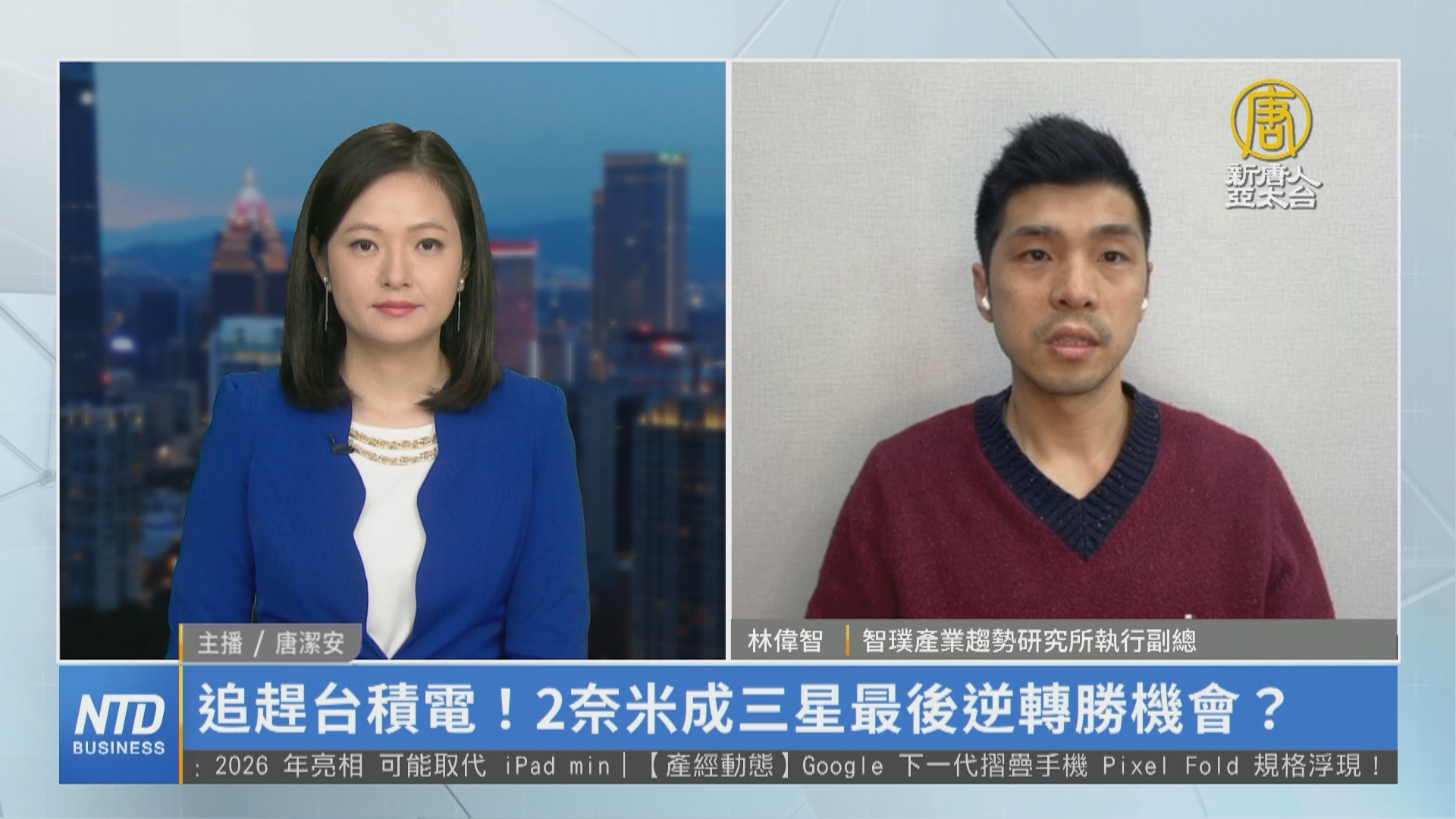 【新唐人亞太台 2024 年 02 月 07 日訊】先進製程成為半導體巨頭競逐焦點,台積電2奈米預定2025年量產,傳出首批產能已獲得蘋果、英特爾等客戶爭取,不過最大對手的南韓三星,也計畫在2025年投入2奈米量產,試圖拉進與台積電的差距。我們請教智璞產業趨勢研究所執行副總林偉智,2奈米是否有望成為三星最後逆轉機會?請教您的看法。
