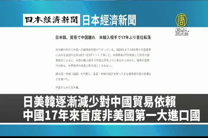 【新唐人亞太台 2024 年 02 月 08 日訊】來看到日本經濟新聞報導:日本、美國、韓國和歐洲逐漸減少對中國的貿易依賴。中國17年來首度跌落美國第一大進口國地位。
