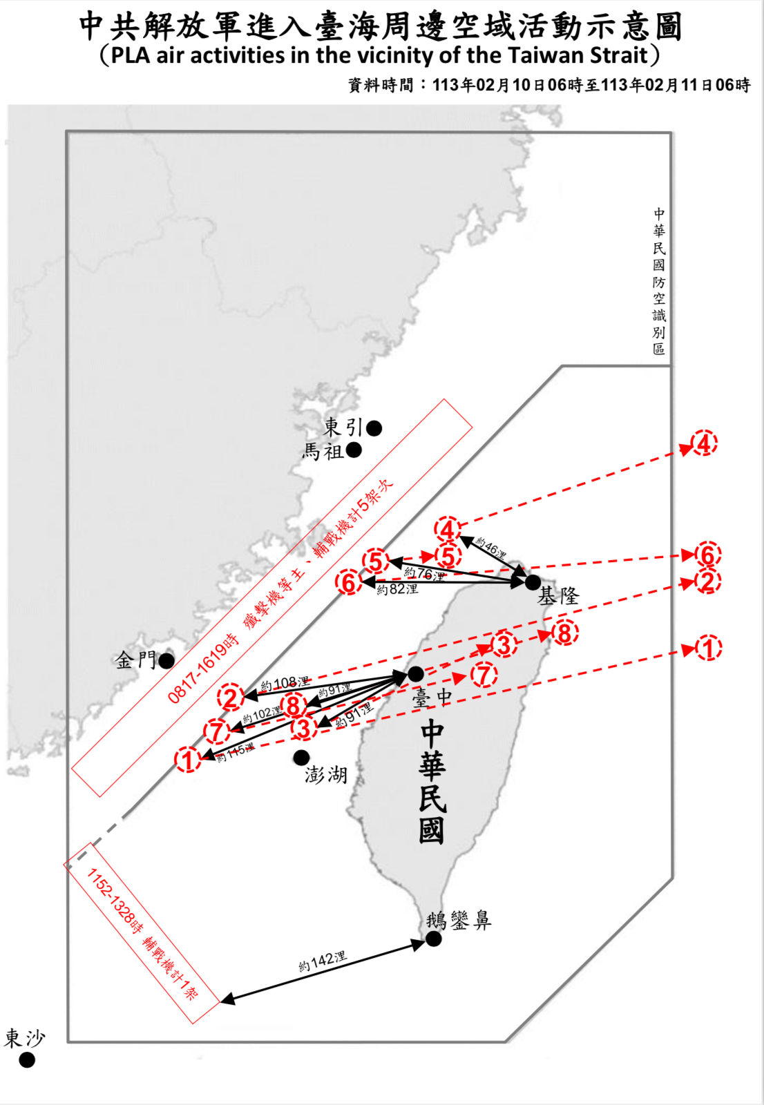 【新唐人亞太台 2024 年 02 月 11 日訊】年節期間共軍頻繁擾台。根據中華民國國防部公布的共軍動態,11日上午6點,24小時內偵獲6架共機、4艘共艦,在台海周邊活動。另外中共空飄氣球也密集出現在台灣上空,10日當天有8顆氣球出現在台灣北部與中部上空,飛行高度介於1萬2千呎到3萬5千呎,飛行路線由西向東,其中6顆空飄氣球進入台灣本島上空,另兩枚氣球則是在基隆外海上空。