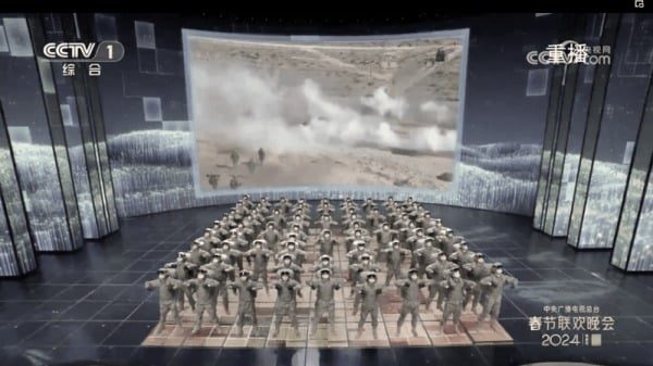 2月9日除夕夜,中共官媒央視播出的春晚中,突然出現頭戴鋼盔、身著土迷彩服、手持長槍的中共軍人登台表演,並高唱軍歌。舞台上還能看到新式戰機、坦克、潛水艇,以及搶灘登陸和導彈齊射等影像。
