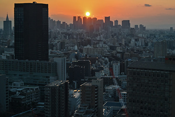 2024年2月10日,夕陽從東京新宿的高樓大廈後面落下。 (RICHARD A. BROOKS:AFP via Getty Images)