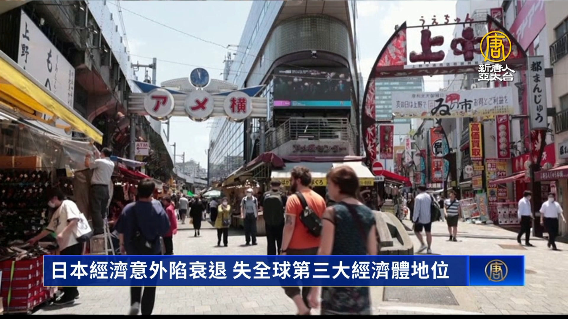 【新唐人亞太台 2024 年 02 月 15 日訊】日本經濟意外陷入衰退,日本政府週四(15日)公佈的數據顯示,繼前1季下滑3.3%之後,日本去年第四季GDP年減0.4%,連續2季的緊縮,通常被視為技術性衰退。GDP數據凸顯日本國內需求因通膨而疲弱不振。以美元計算,日本2023年名義GDP,已被德國超越,下降至世界第4位。彭博分析,GDP數據不如預期,日本央行要結束負利率政策,面臨更複雜的局面。