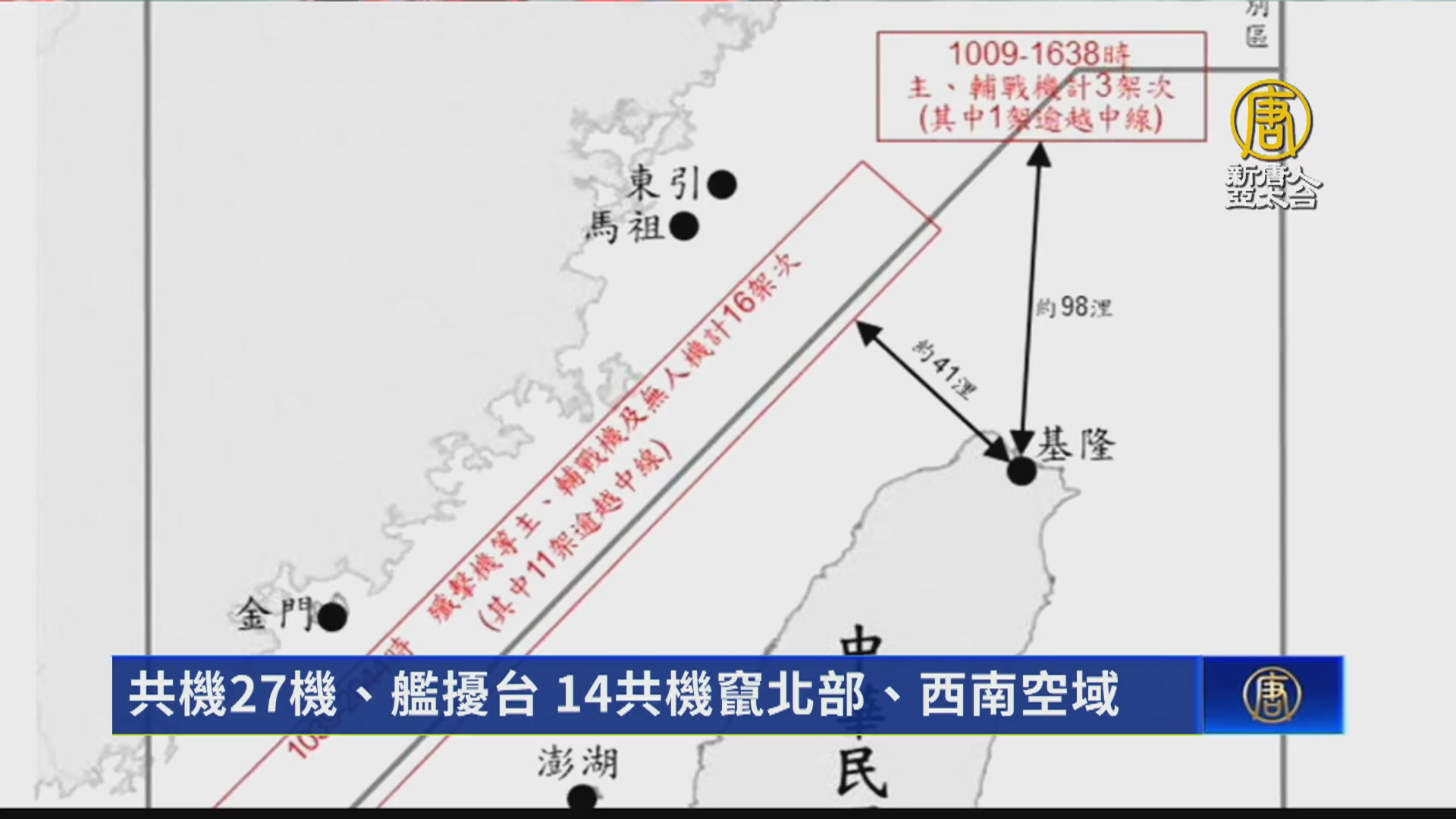 【新唐人亞太台 2024 年 02 月 15 日訊】好,過年期間,共軍持續在台海周邊活動,破壞區域情勢穩定。台灣國防部公布:截至今天上午6點的24小時內,偵獲共機21架次、共艦6艘次,持續在台海周邊活動。其中,14架次共機逾越海峽中線後,進入台灣北部及西南空域。這也創下過年以來共機擾台架次的新高。國防部強調,國軍運用任務機、艦及岸置飛彈系統嚴密監控與應處。