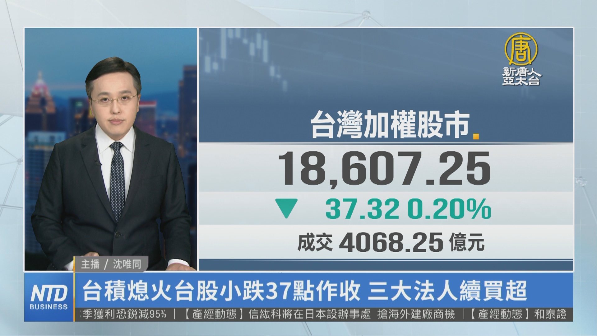 【新唐人亞太台 2024 年 02 月 16 日訊】新聞一開始帶您關心國際股市,美股三大指數周四(15日)收漲,標普 500指數收盤創下歷史新高,美國零售銷售數據放緩,減輕投資人對通膨的擔憂,台股方面,今天受到台積電、世芯-KY、力旺等高價股走跌影響,終場下跌37.32點,收在18607.25點。權值股稍稍走弱,由中小型個股撐盤,成交量4061億元,三大法人合計買超68.92億元。法人指出,台股歷經15日龍年開紅盤補漲,預期權值股走勢放緩下,大盤可能持續震盪整理。