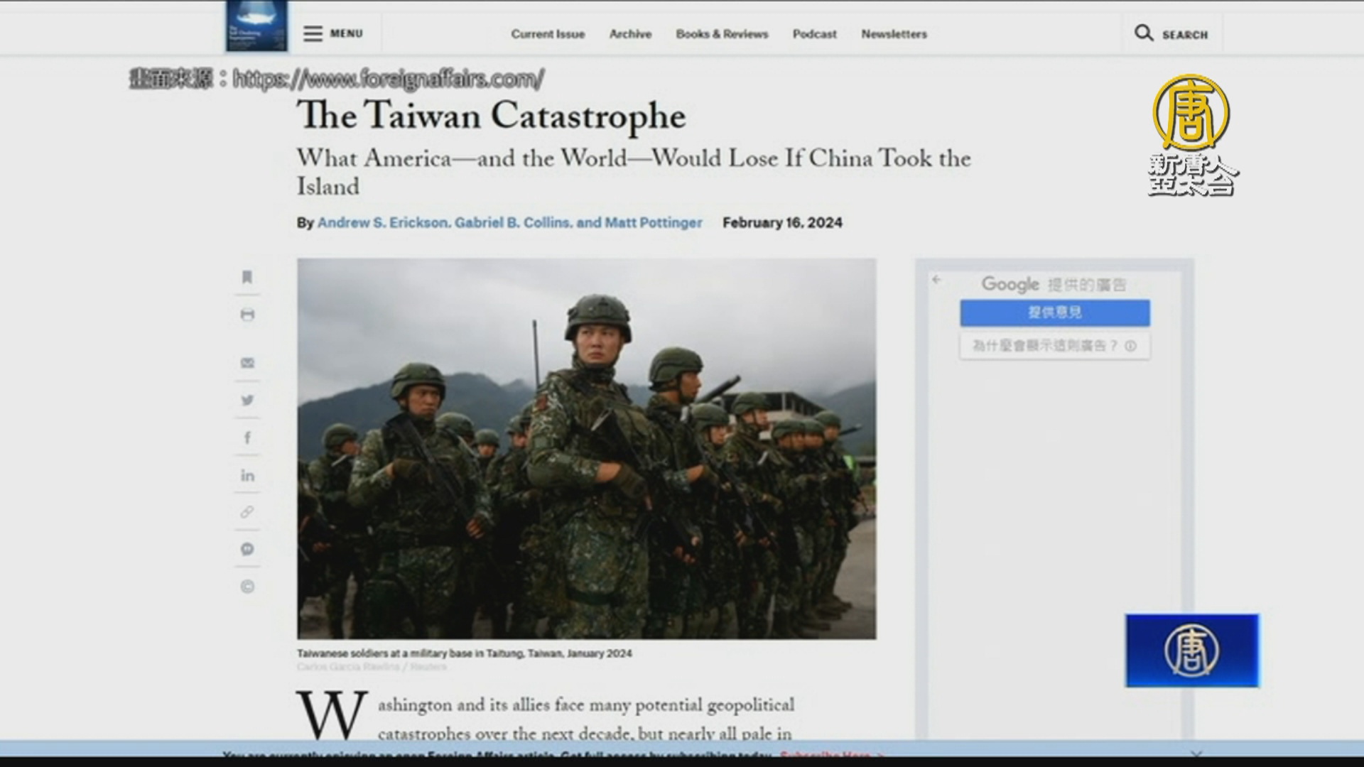 美國海軍戰爭學院(Naval War College)教授艾立信(Andrew S. Erickson)、美國萊斯大學(Rice University)研究員柯林斯(Gabriel B. Collins)與美國前副國家安全顧問博明(Matt Pottinger)16日在美國「外交事務」雜誌(Foreign Affairs)發表題為「台灣災難」(The Taiwan Catastrophe)的文章,副標題則為,若台灣遭中共佔領,美國與世界將失去什麼。