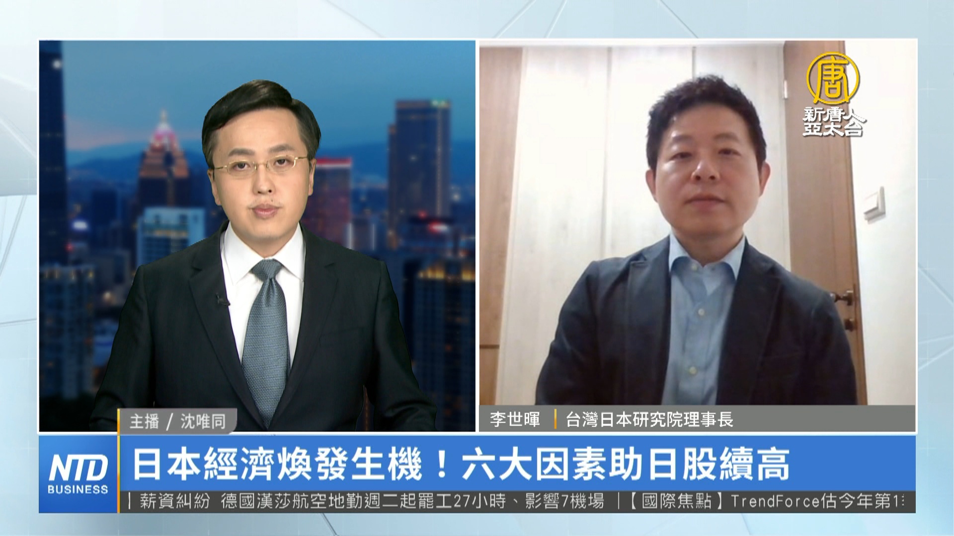 【新唐人亞太台 2024 年 02 月 19 日訊】日本政府數據顯示,去年第4季日本經濟陷入衰退,失去第三大經濟體寶座,不過,日股在國際資金湧入、日圓貶值等因素,從去年以來不斷上漲。我們請教台灣日本研究院理事長李世暉,您觀察日本經濟現況,相較過去失落三十年,是否已經出現翻轉?今年日股再度上揚15%,是否有機會再創歷史新高?
