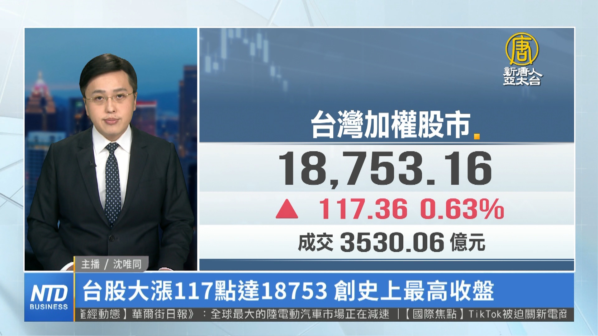 【新唐人亞太台 2024 年 02 月 20 日訊】周一美股適逢總統日休市,市場靜待輝達(Nvidia)財報公布。周二台股創下紀錄,在台積電(2330)翻紅走高下,盤中創18756.33點新高;收盤上漲117.36點,來到18753.16點,也是史上最高收盤。今日外資買超63.7844億元。