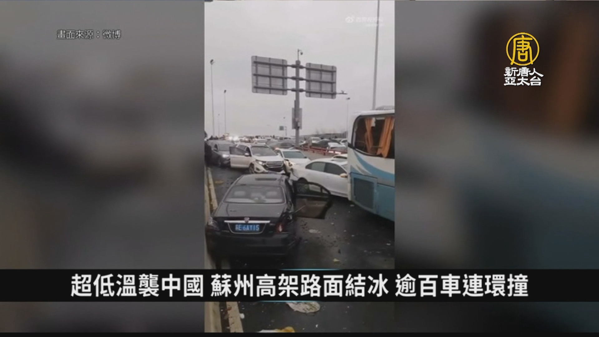 2月23日上午7點多,江蘇省蘇州工業園區一高架路段因道路結冰,發生上百輛車連環相撞,有的車輛疊在別的車頂,不少車輛毀損嚴重,事故造成至少9人受傷。22日晚間,蘇州氣象台曾發佈黃色預警,稱受降水和低溫影響,高架、橋梁等路段將出現道路結冰。