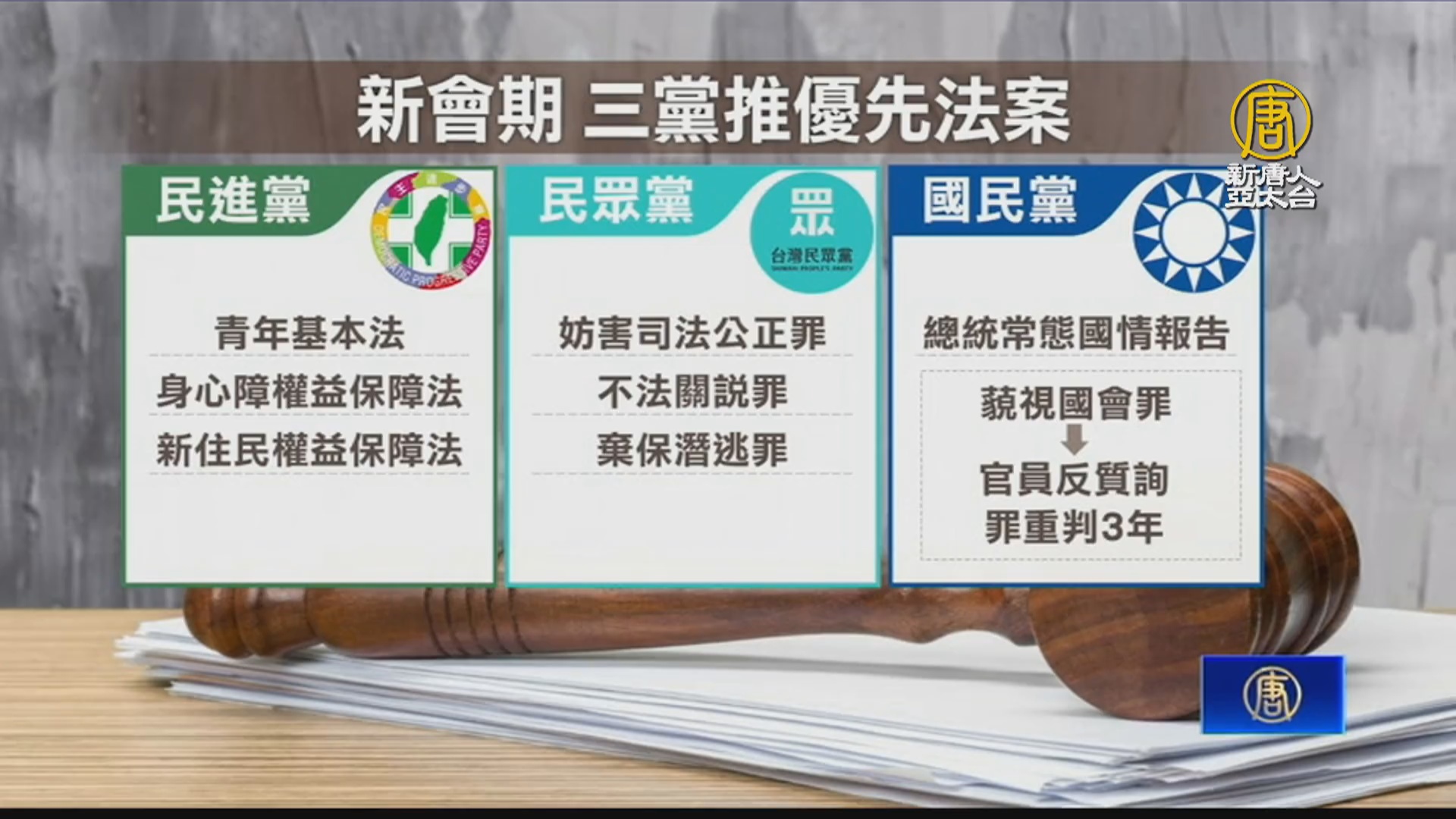 【新唐人亞太台 2024 年 03 月 05 日訊】立法院迎接新會期,這一屆立院三黨不過半,外界關注各黨表現。民進黨著重民生法案,提出青年基本法、身心障者權益保障法等,國民黨關注國會改革,並提出「藐視國會罪」,而民眾黨則主打司改。三黨焦點不一,未來勢必會繼續上演攻防戰。