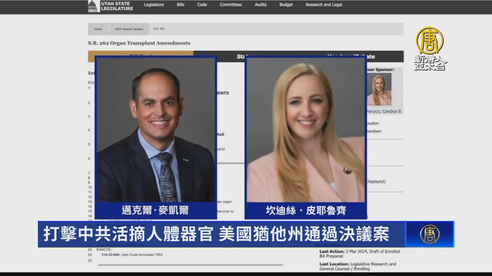 【新唐人亞太台 2024 年 03 月 07 日訊】美國猶他州眾議院,近日一致通過法案,打擊中共活摘器官的暴行。這是繼去年六月德州之後,美國第二個州立法反對活摘器官。亞利桑那州、愛達荷州和密蘇里州也在陸續批准相關法案。
