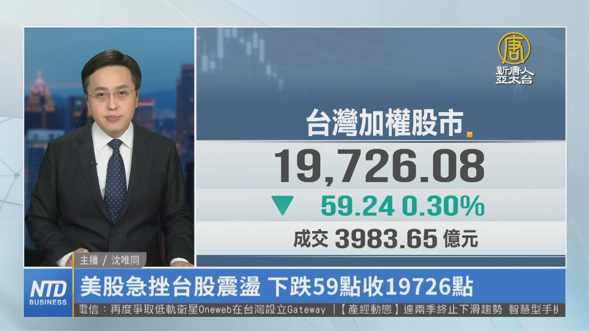 【新唐人亞太台 2024 年 03 月 11 日訊】美股上周五開高後,急轉直下,半導體類股帶頭下殺,AI晶片大廠輝達,股價重挫5.6%,尤其今年以來標普500指數大漲35%,有超漲疑慮,也讓市場出現明顯賣壓。台股上周五一度挑戰兩萬點,不過美股回檔影響,周一早盤下跌逾百點,最低來到19654.99點,不過盤中跌幅收斂,終場收19726.08點,下跌59.24點。外資賣超87億,投信續買,三大法人合計賣超33.85億。